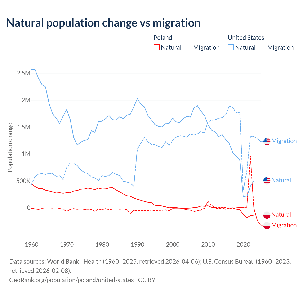 Over the last 10 years, 41.4% of the population change in Poland is from natural causes (a loss of 675,443 people) and 58.6% is from migration (a gain of 955,766 people). In the United States 35.8% is from natural causes (a gain of 8,005,866 people) and 64.2% is from migration (a gain of 14,334,286 people).
