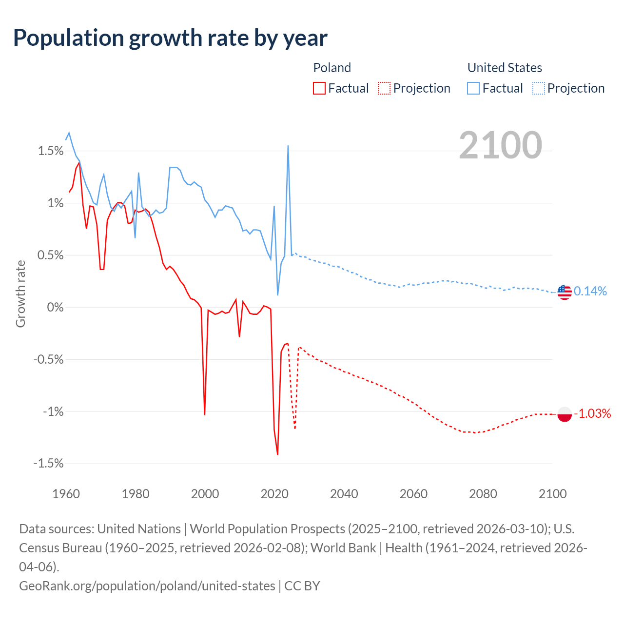 - For the last 10 years, Poland has had an average growth rate of -0.36% per year vs +0.65% in the United States.