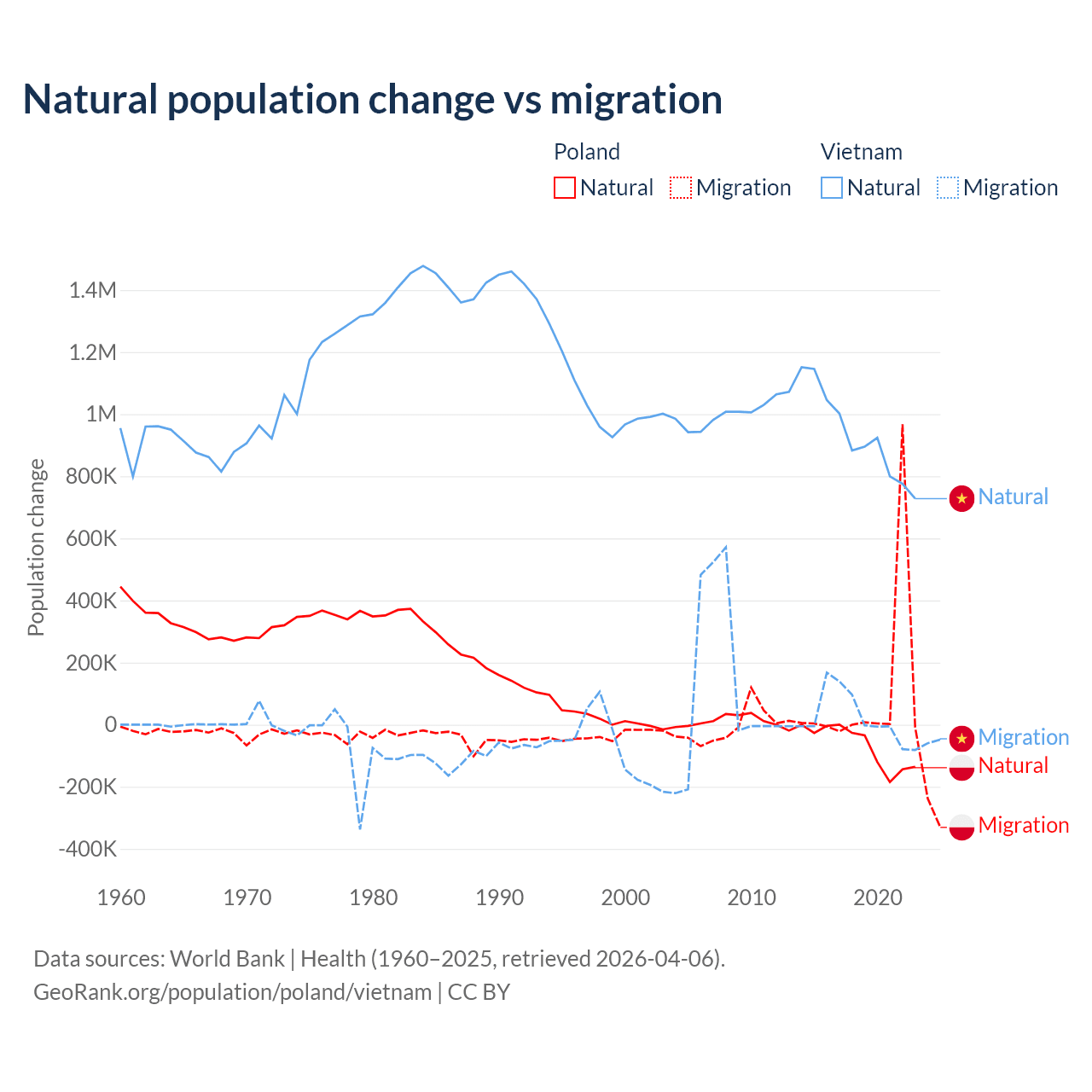 Over the last 10 years, 41.4% of the population change in Poland is from natural causes (a loss of 675,443 people) and 58.6% is from migration (a gain of 955,766 people). In Vietnam 97.7% is from natural causes (a gain of 9,349,756 people) and 2.29% is from migration (a gain of 219,073 people).