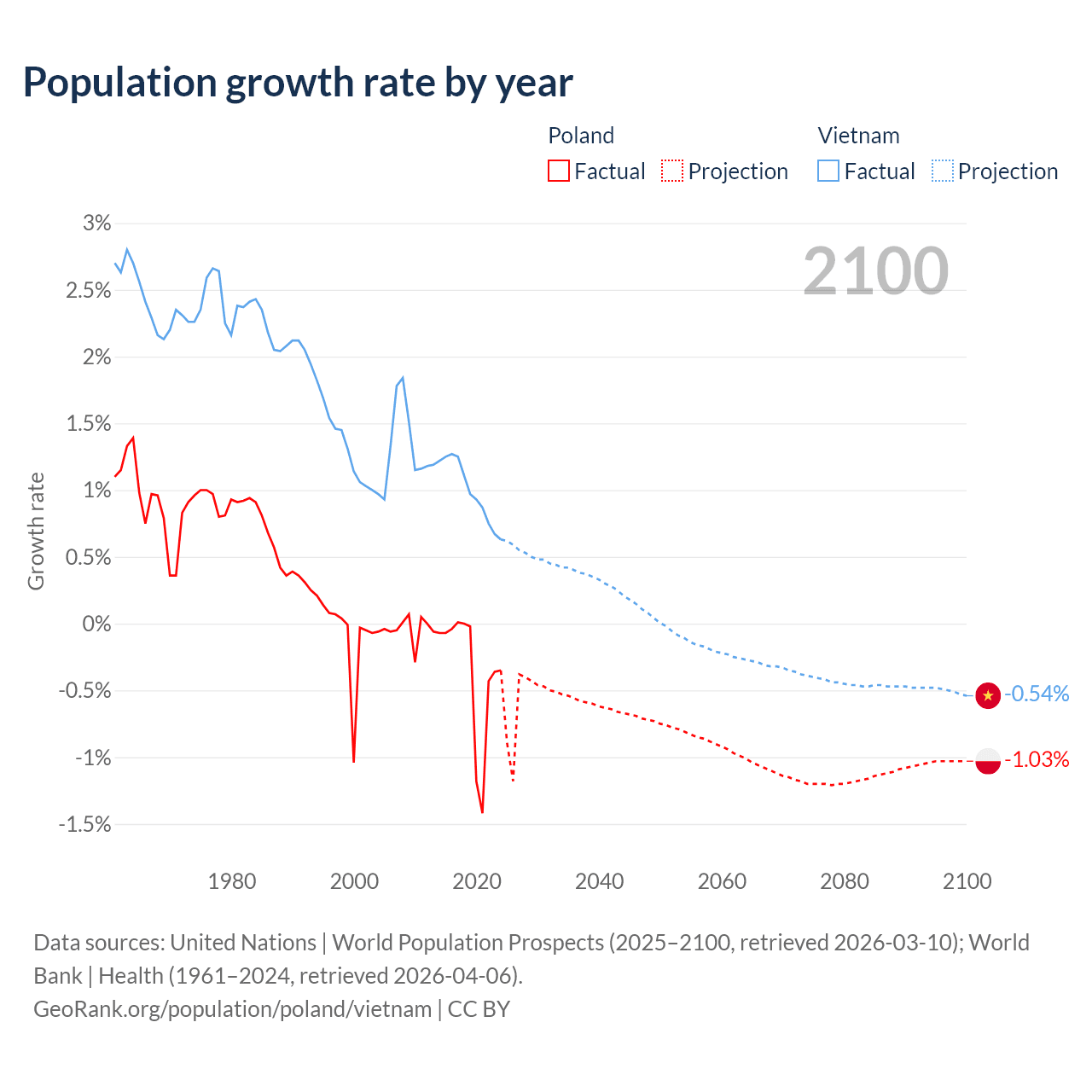 - For the last 10 years, Poland has had an average growth rate of -0.36% per year vs +0.99% in Vietnam.