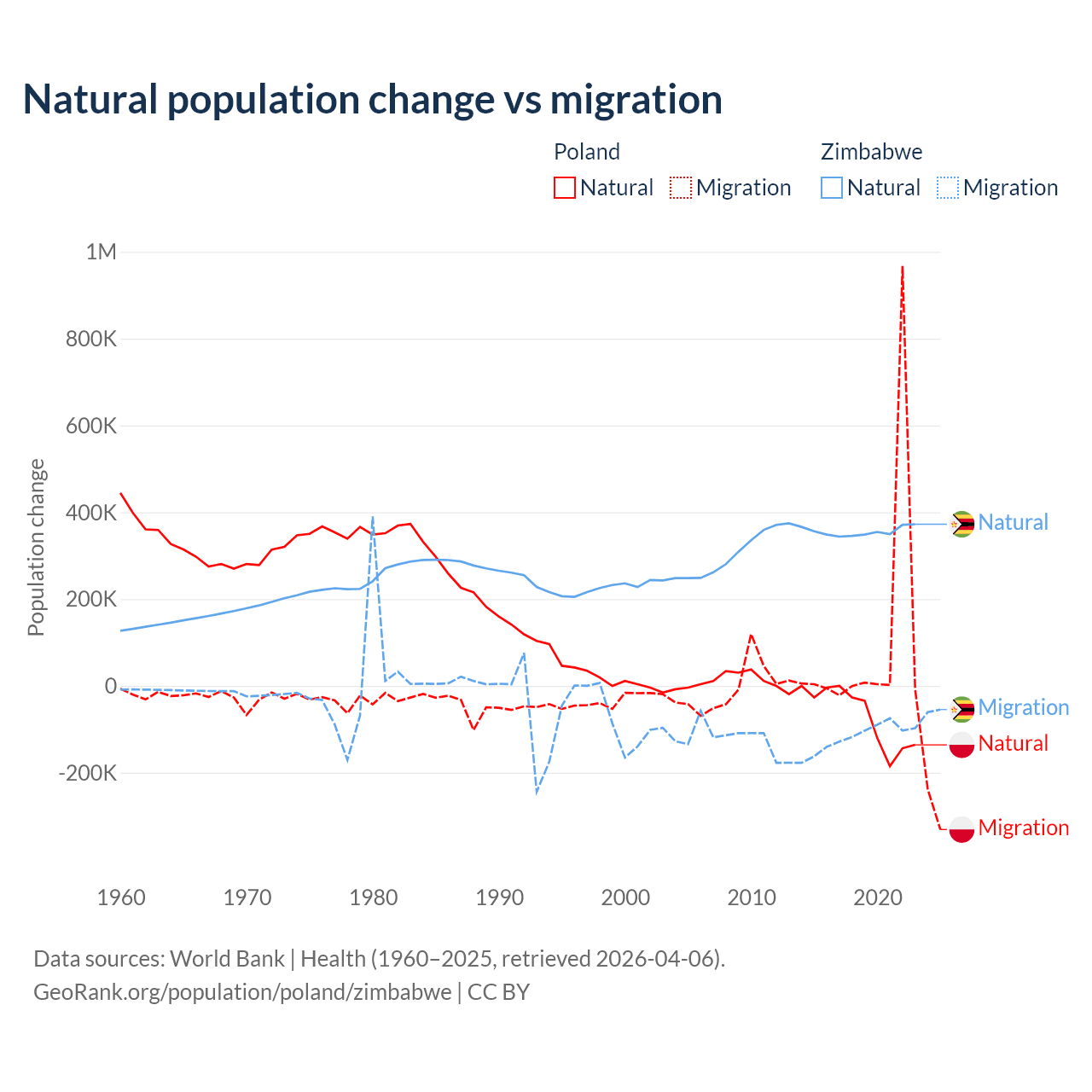 Over the last 10 years, 41.4% of the population change in Poland is from natural causes (a loss of 675,443 people) and 58.6% is from migration (a gain of 955,766 people). In Zimbabwe 74.9% is from natural causes (a gain of 3,558,487 people) and 25.1% is from migration (a loss of 1,192,807 people).