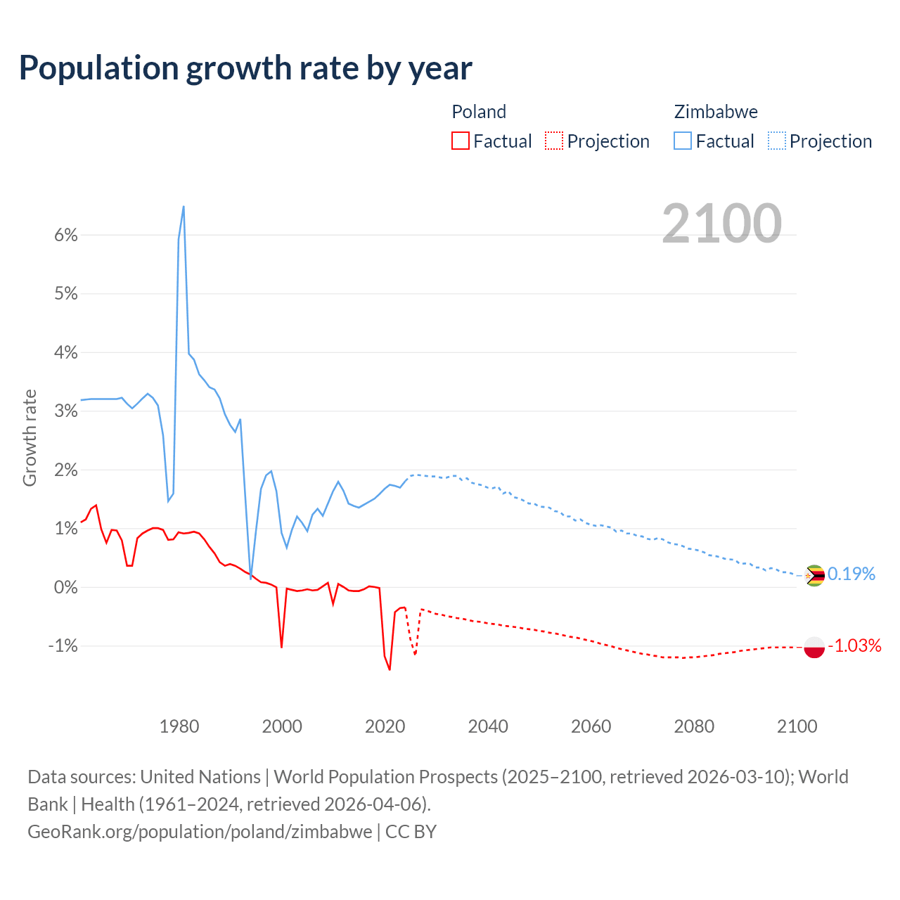 - For the last 10 years, Poland has had an average growth rate of -0.36% per year vs +1.57% in Zimbabwe.
