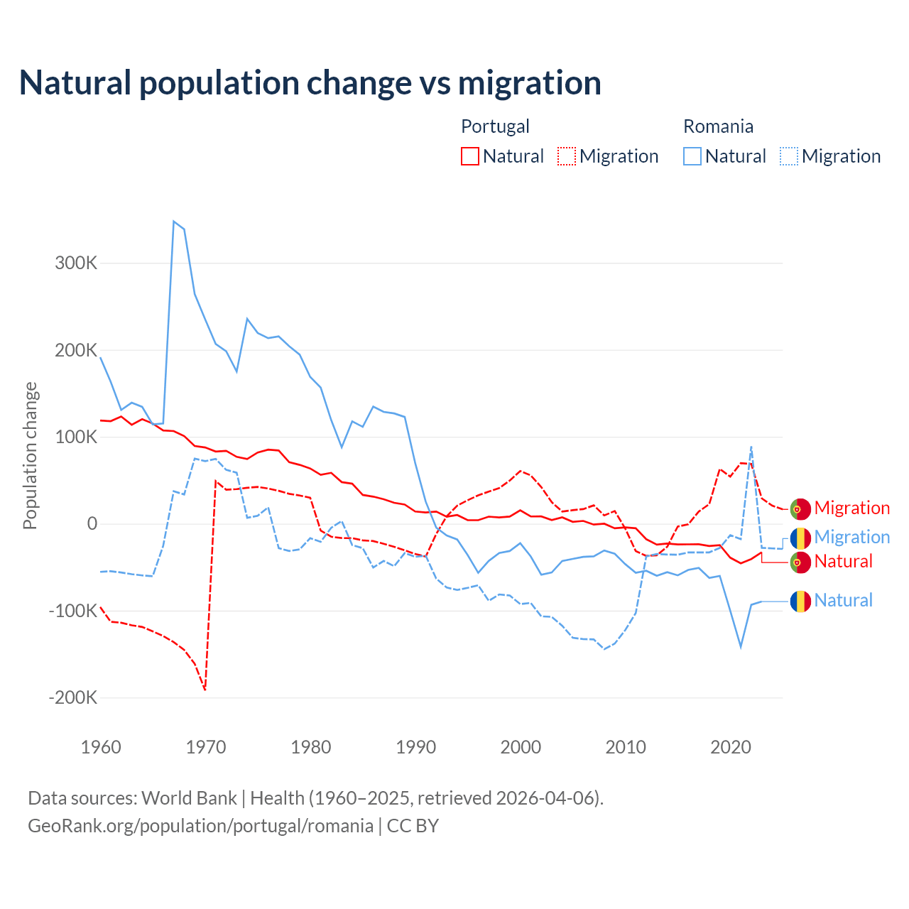 Over the last 10 years, 51% of the population change in Portugal is from natural causes (a loss of 302,748 people) and 49% is from migration (a gain of 290,554 people). In Romania 82% is from natural causes (a loss of 766,295 people) and 18% is from migration (a loss of 167,917 people).
