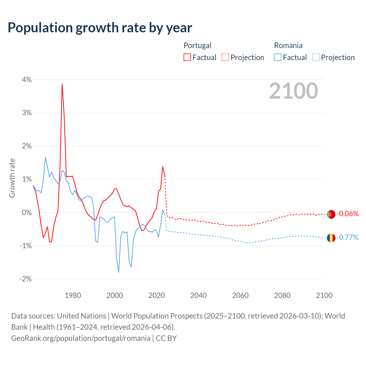 - For the last 10 years, Portugal has had an average growth rate of +0.21% per year vs -0.43% in Romania.
