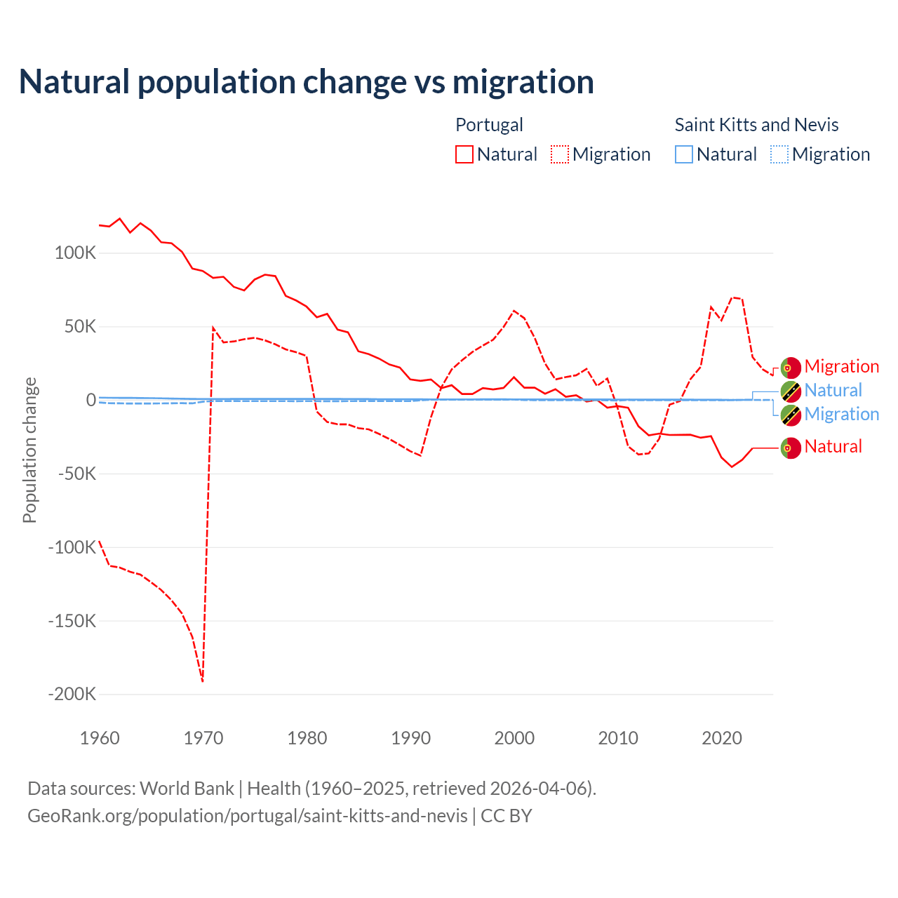Over the last 10 years, 51% of the population change in Portugal is from natural causes (a loss of 302,748 people) and 49% is from migration (a gain of 290,554 people). In Saint Kitts and Nevis 44.9% is from natural causes (a gain of 1,225 people) and 55.1% is from migration (a loss of 1,506 people).