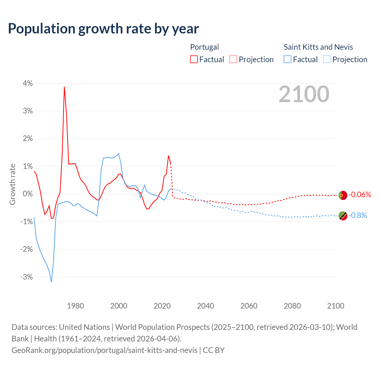 - For the last 10 years, Portugal has had an average growth rate of +0.21% per year vs -0.04% in Saint Kitts and Nevis.
