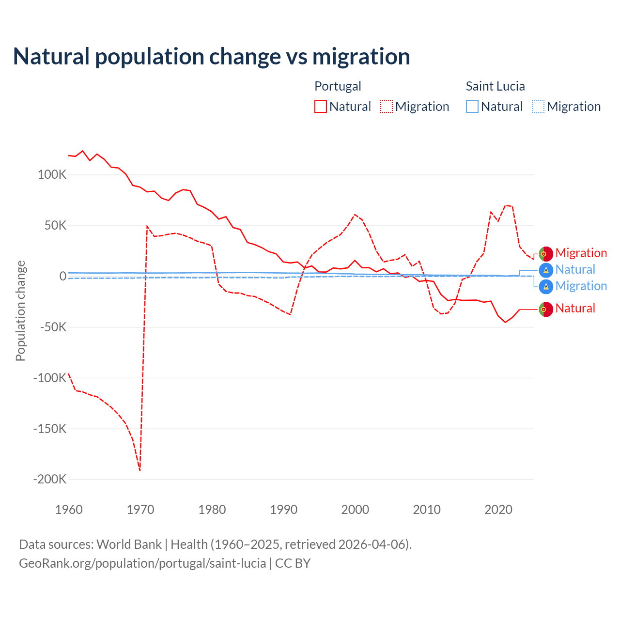 Over the last 10 years, 51% of the population change in Portugal is from natural causes (a loss of 302,748 people) and 49% is from migration (a gain of 290,554 people). In Saint Lucia 95.7% is from natural causes (a gain of 6,039 people) and 4.31% is from migration (a loss of 272 people).