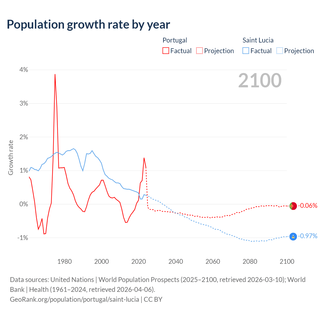- For the last 10 years, Portugal has had an average growth rate of +0.21% per year vs +0.33% in Saint Lucia.