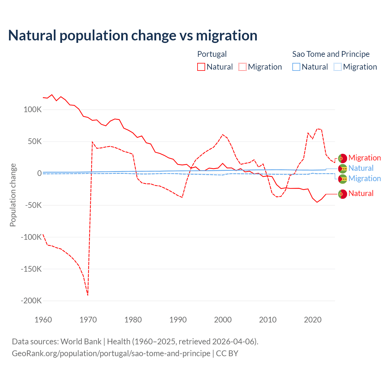 Over the last 10 years, 51% of the population change in Portugal is from natural causes (a loss of 302,748 people) and 49% is from migration (a gain of 290,554 people). In Sao Tome and Principe 80.1% is from natural causes (a gain of 50,822 people) and 19.9% is from migration (a loss of 12,621 people).