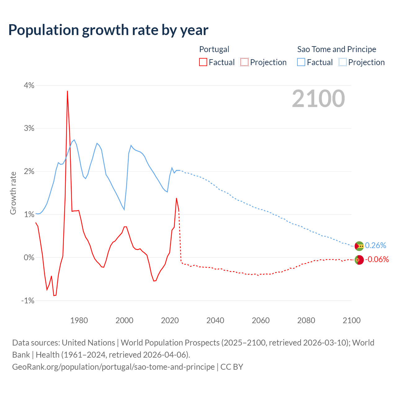 - For the last 10 years, Portugal has had an average growth rate of +0.21% per year vs +1.82% in Sao Tome and Principe.