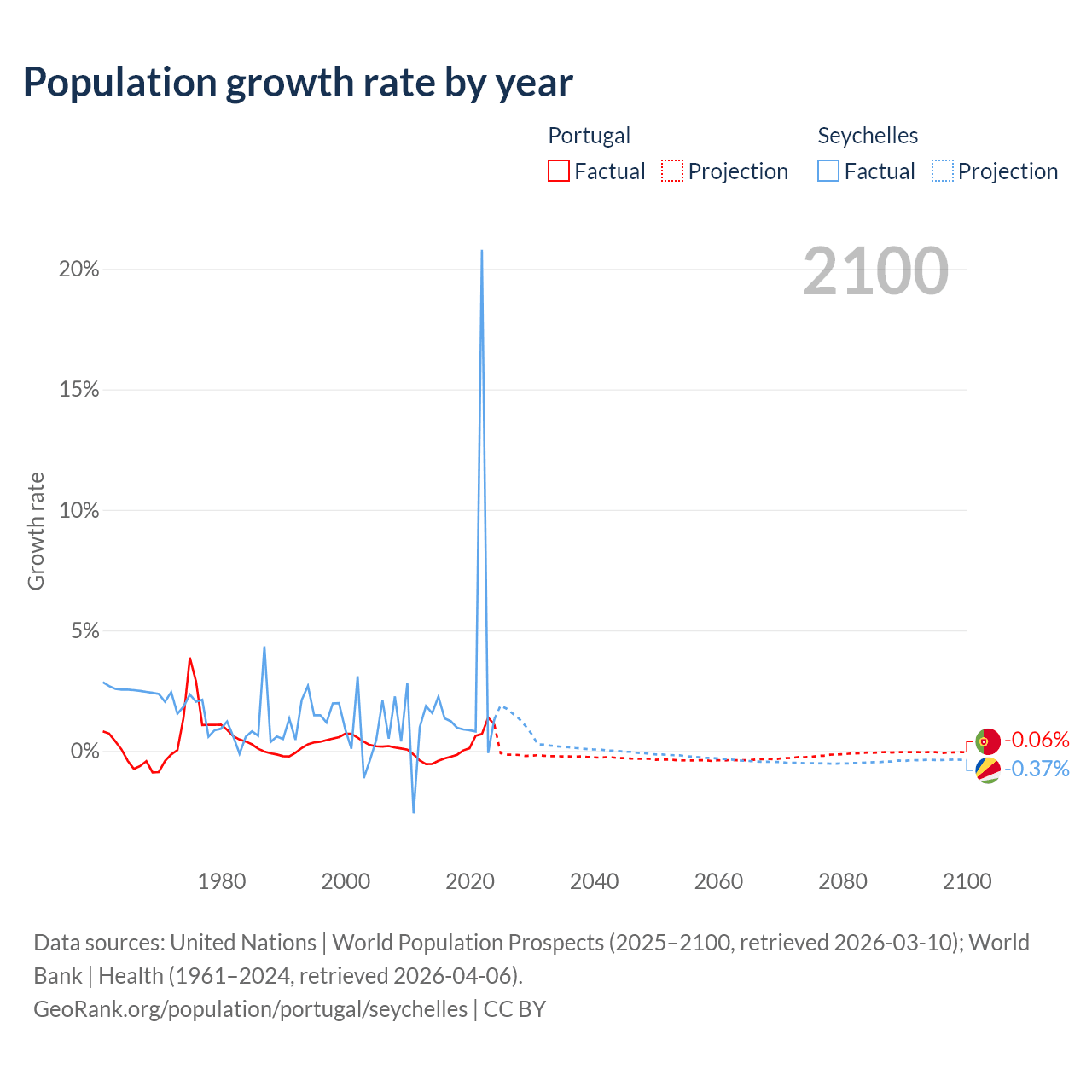 - For the last 10 years, Portugal has had an average growth rate of +0.21% per year vs +2.9% in the Seychelles.