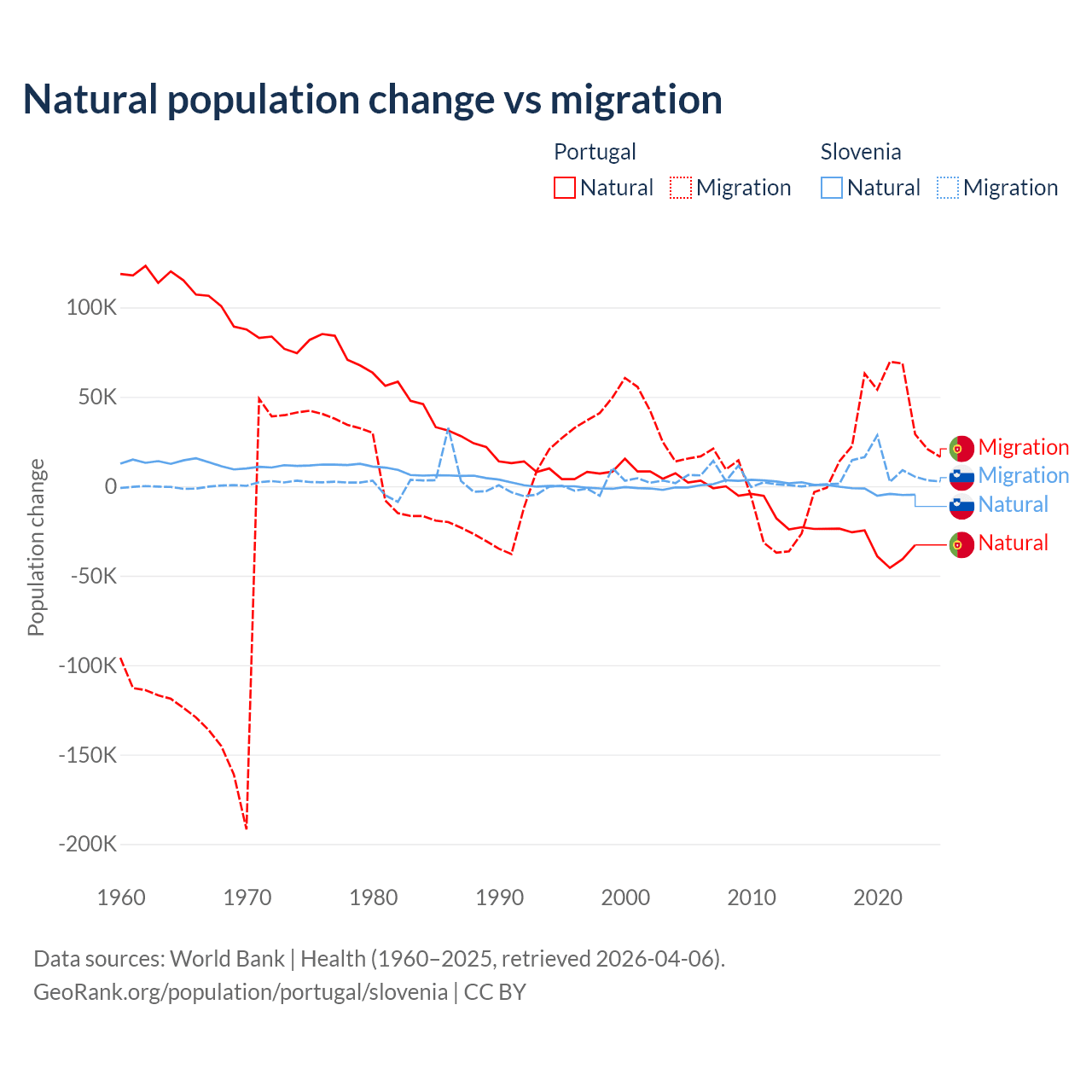 Over the last 10 years, 51% of the population change in Portugal is from natural causes (a loss of 302,748 people) and 49% is from migration (a gain of 290,554 people). In Slovenia 18.1% is from natural causes (a loss of 17,573 people) and 81.9% is from migration (a gain of 79,532 people).