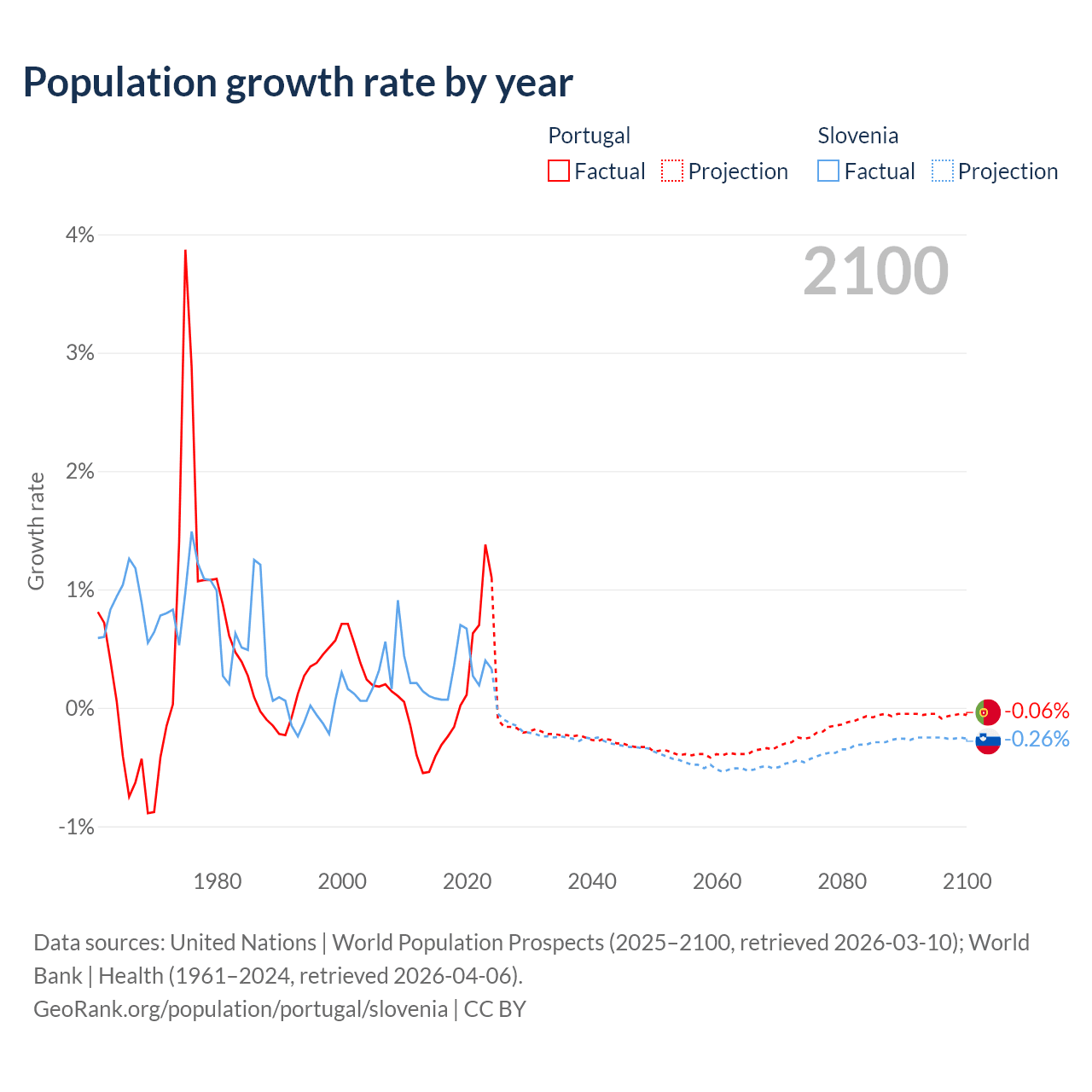 - For the last 10 years, Portugal has had an average growth rate of +0.21% per year vs +0.29% in Slovenia.