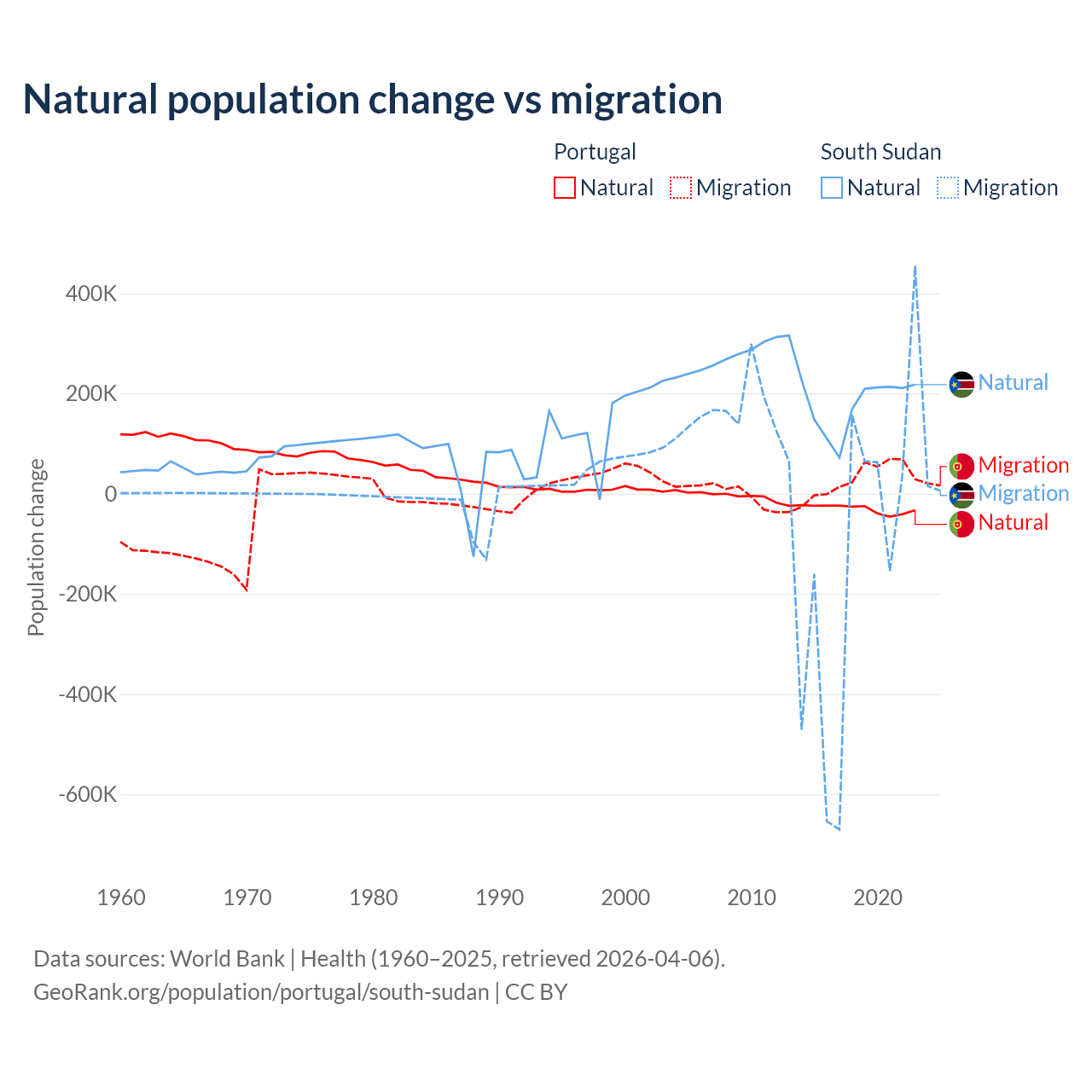Over the last 10 years, 51% of the population change in Portugal is from natural causes (a loss of 302,748 people) and 49% is from migration (a gain of 290,554 people). In South Sudan 57.4% is from natural causes (a gain of 1,792,135 people) and 42.6% is from migration (a loss of 1,329,606 people).
