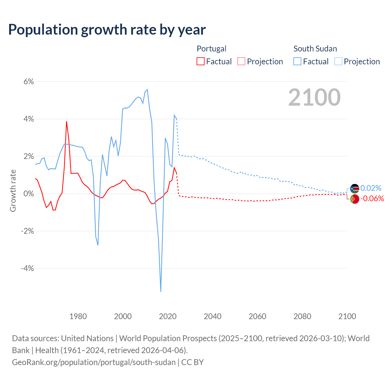 - For the last 10 years, Portugal has had an average growth rate of +0.21% per year vs +0.65% in South Sudan.
