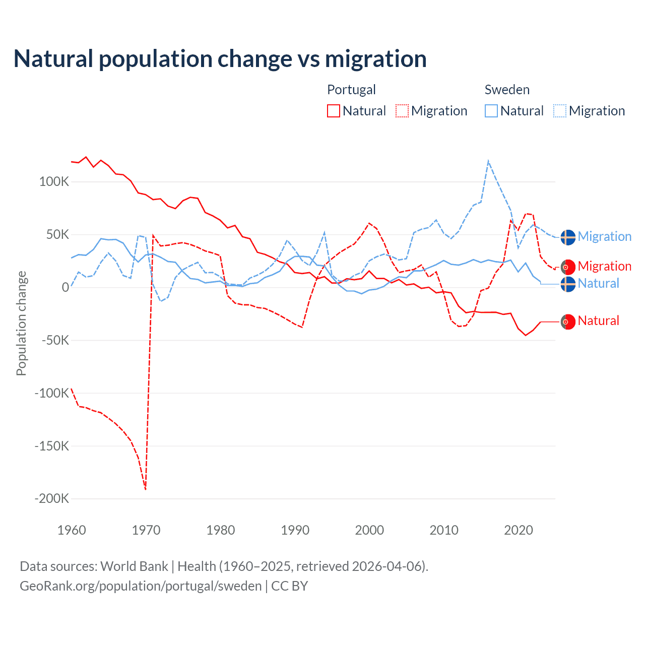 Over the last 10 years, 51% of the population change in Portugal is from natural causes (a loss of 302,748 people) and 49% is from migration (a gain of 290,554 people). In Sweden 21.4% is from natural causes (a gain of 201,900 people) and 78.6% is from migration (a gain of 743,642 people).