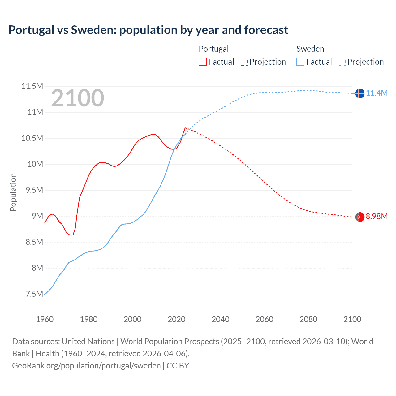 Portugal vs Sweden: population by year and forecast