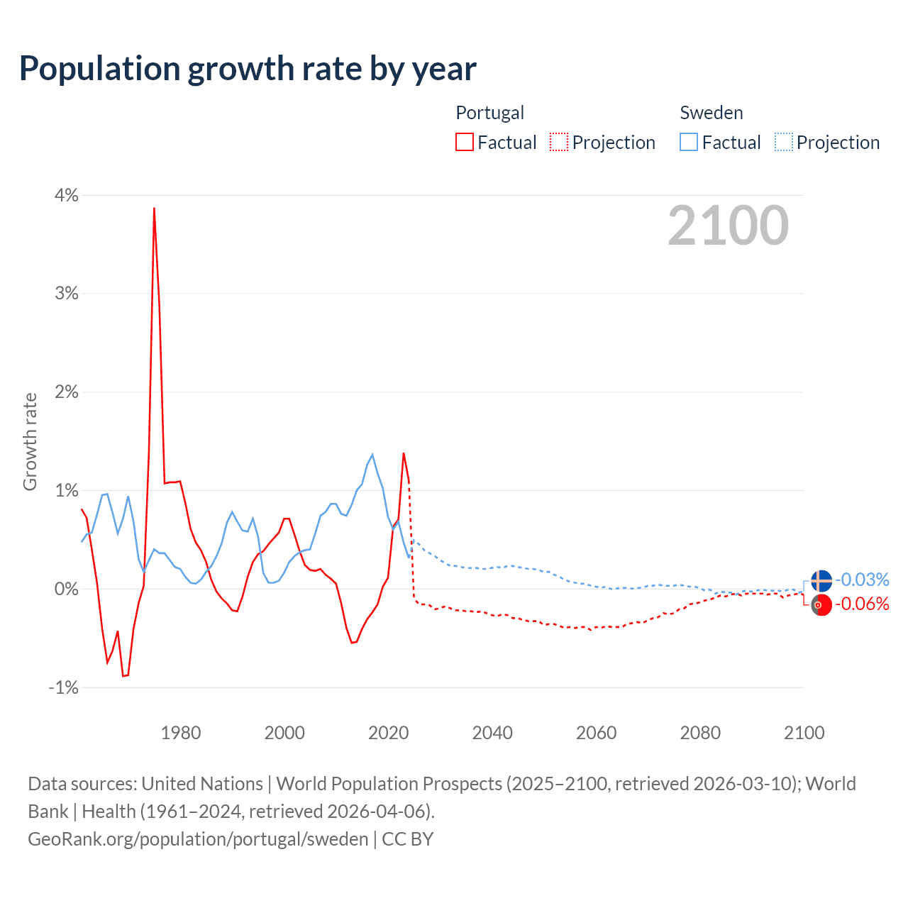 - For the last 10 years, Portugal has had an average growth rate of +0.21% per year vs +0.88% in Sweden.