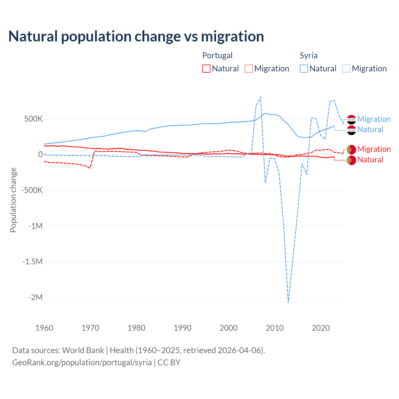 Over the last 10 years, 51% of the population change in Portugal is from natural causes (a loss of 302,748 people) and 49% is from migration (a gain of 290,554 people). In Syria 91.3% is from natural causes (a gain of 3,047,621 people) and 8.72% is from migration (a gain of 291,069 people).
