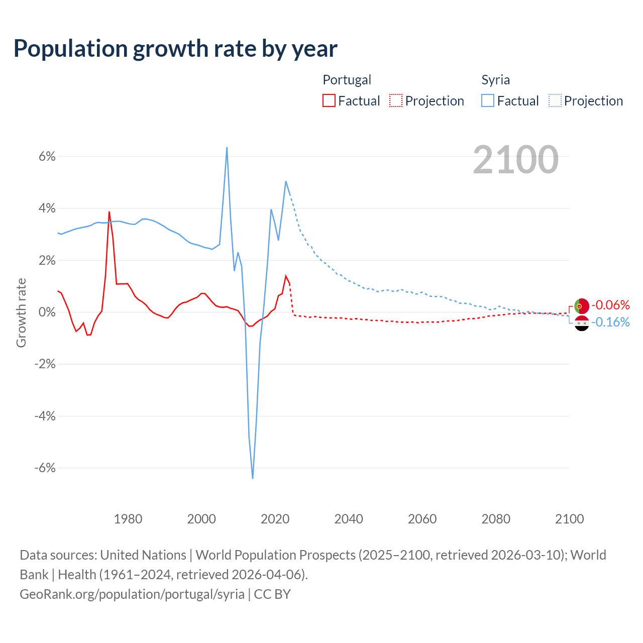 - For the last 10 years, Portugal has had an average growth rate of +0.21% per year vs +1.25% in Syria.