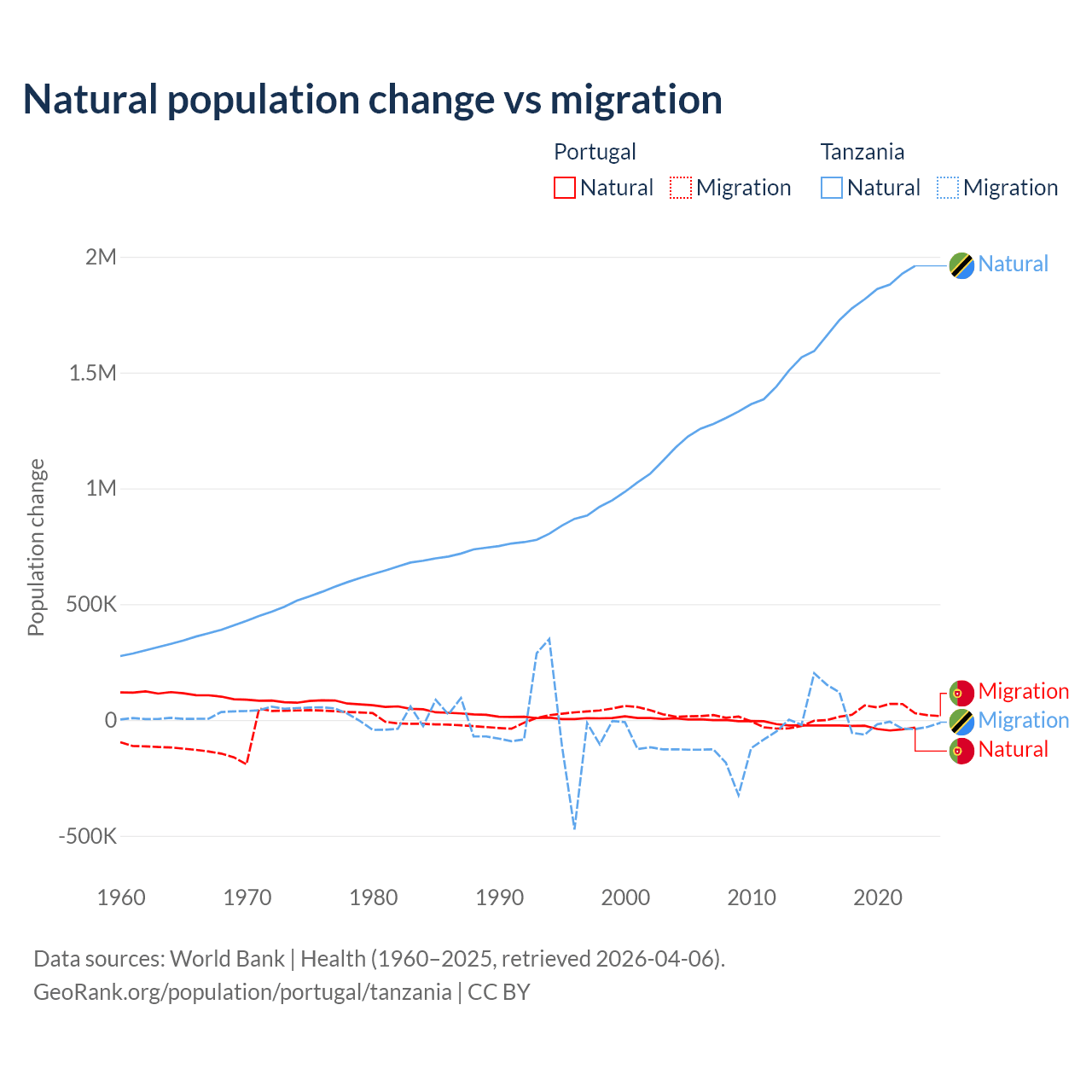 Over the last 10 years, 51% of the population change in Portugal is from natural causes (a loss of 302,748 people) and 49% is from migration (a gain of 290,554 people). In Tanzania 98.7% is from natural causes (a gain of 17,769,541 people) and 1.27% is from migration (a gain of 229,466 people).