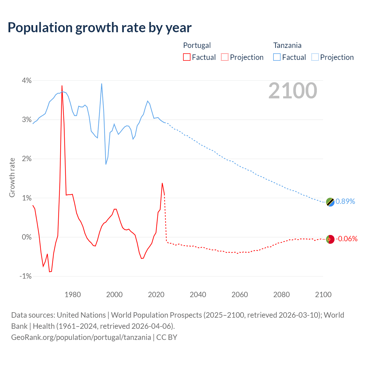 - For the last 10 years, Portugal has had an average growth rate of +0.21% per year vs +3.13% in Tanzania.