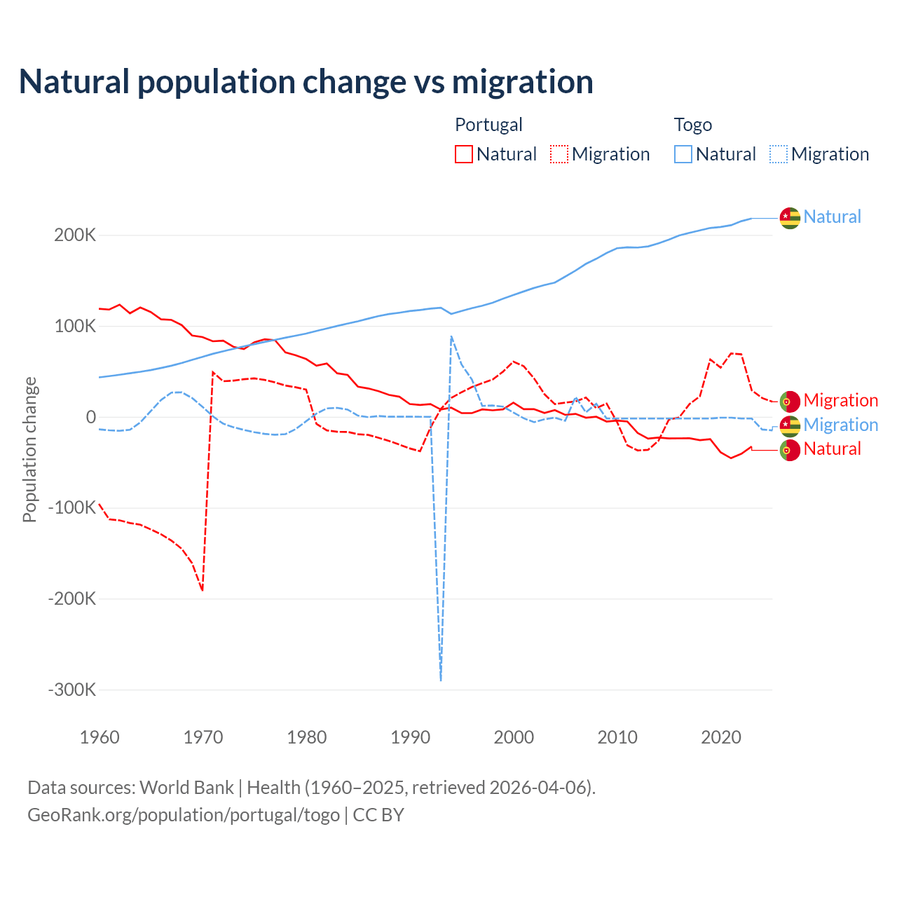 Over the last 10 years, 51% of the population change in Portugal is from natural causes (a loss of 302,748 people) and 49% is from migration (a gain of 290,554 people). In Togo 99.1% is from natural causes (a gain of 2,052,115 people) and 0.86% is from migration (a loss of 17,852 people).