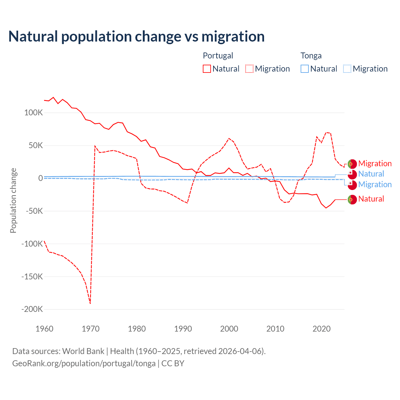 Over the last 10 years, 51% of the population change in Portugal is from natural causes (a loss of 302,748 people) and 49% is from migration (a gain of 290,554 people). In Tonga 46.9% is from natural causes (a gain of 18,919 people) and 53.1% is from migration (a loss of 21,384 people).