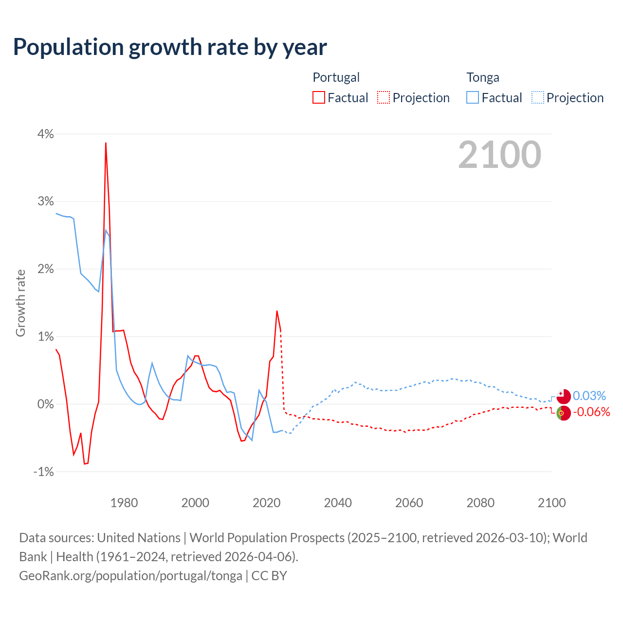 - Since 2006, the population of Portugal has increased from 10.5M people to 10.7M (1.38% growth), while Tonga has declined from 106K to 103K (2.77% decline).