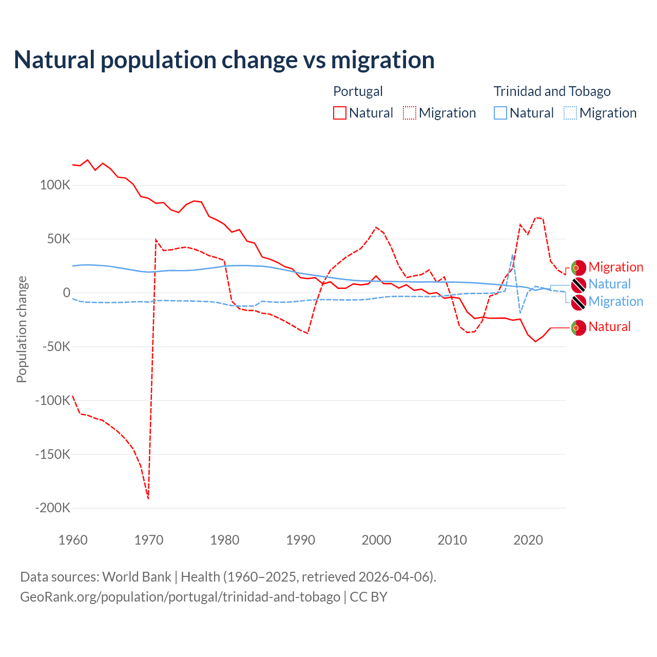 Over the last 10 years, 51% of the population change in Portugal is from natural causes (a loss of 302,748 people) and 49% is from migration (a gain of 290,554 people). In Trinidad and Tobago 66% is from natural causes (a gain of 55,887 people) and 34% is from migration (a gain of 28,785 people).