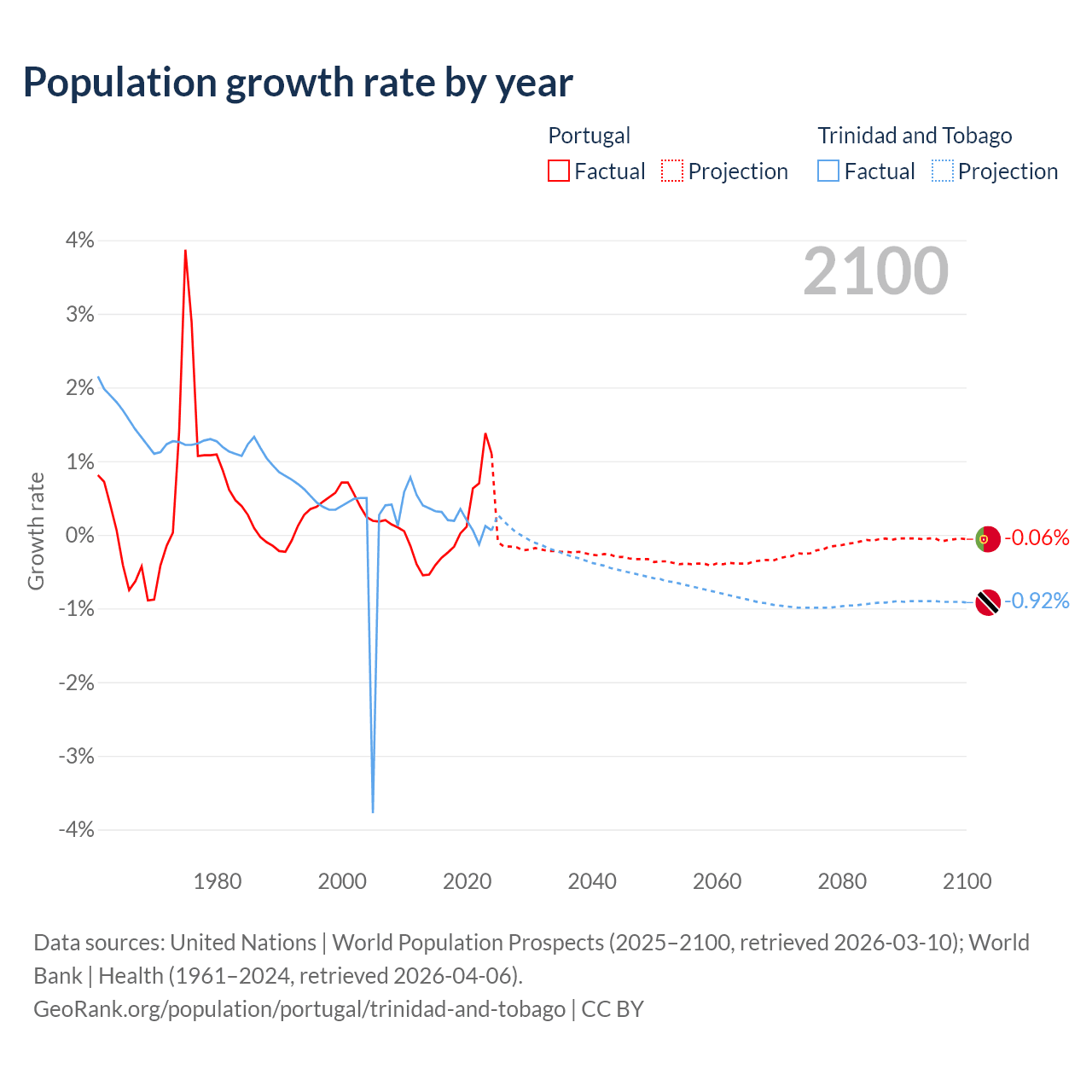 - For the last 10 years, Portugal has had an average growth rate of +0.21% per year vs +0.19% in Trinidad and Tobago.