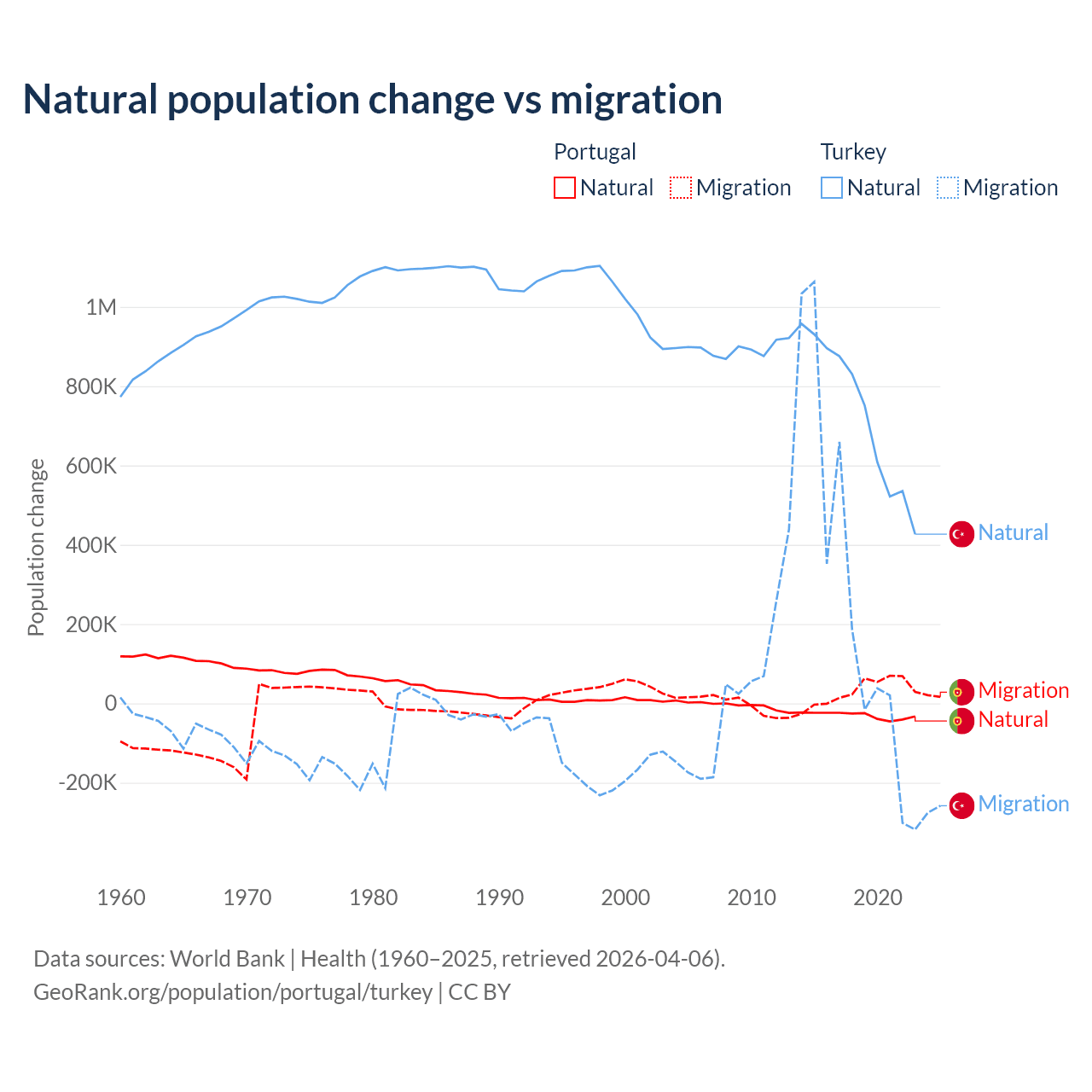 Over the last 10 years, 51% of the population change in Portugal is from natural causes (a loss of 302,748 people) and 49% is from migration (a gain of 290,554 people). In Turkey 73% is from natural causes (a gain of 7,333,352 people) and 27% is from migration (a gain of 2,718,916 people).