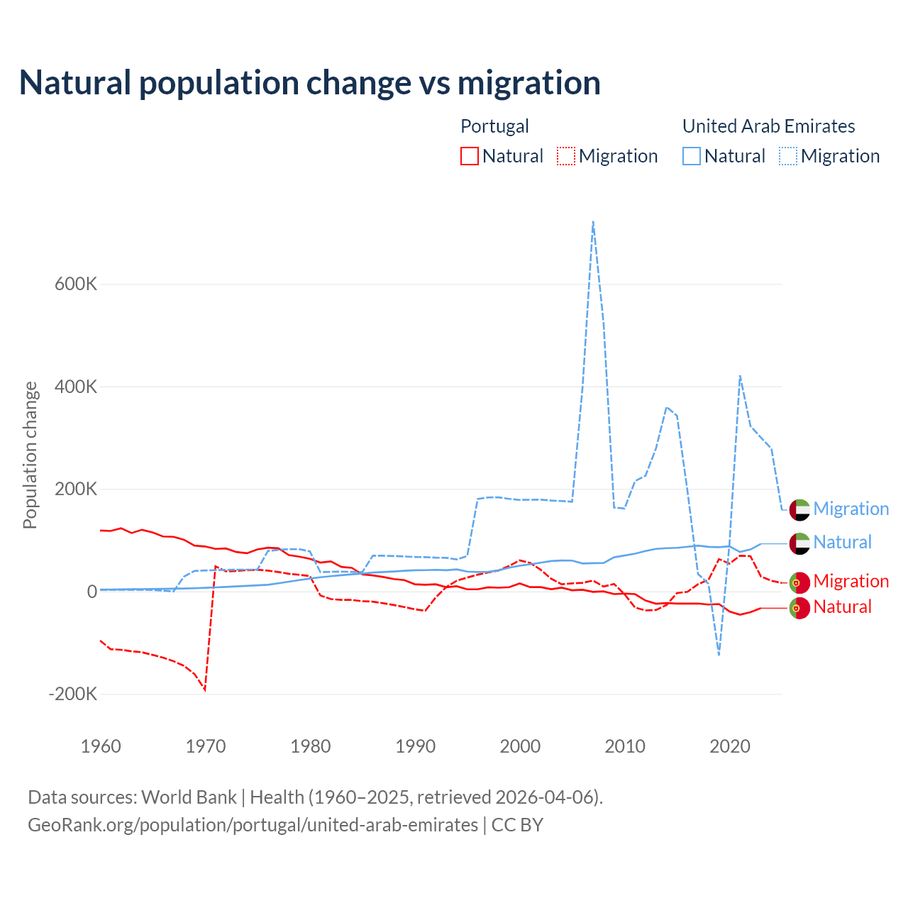 Over the last 10 years, 51% of the population change in Portugal is from natural causes (a loss of 302,748 people) and 49% is from migration (a gain of 290,554 people). In the United Arab Emirates 30.5% is from natural causes (a gain of 857,996 people) and 69.5% is from migration (a gain of 1,958,520 people).