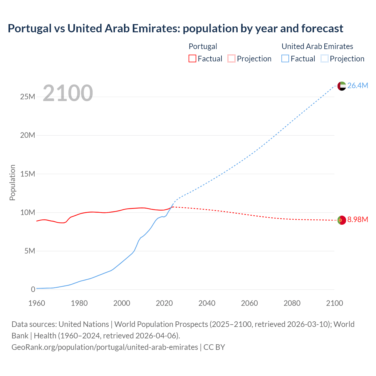 The latest officially reported population of Portugal was 10,694,681 in 2024 vs 10,986,400 people in the United Arab Emirates in 2024. In 2026, based on the adjusted UN estimation, the current Portugal's population is 10,667,081 people compared to 11,686,438 in the United Arab Emirates.