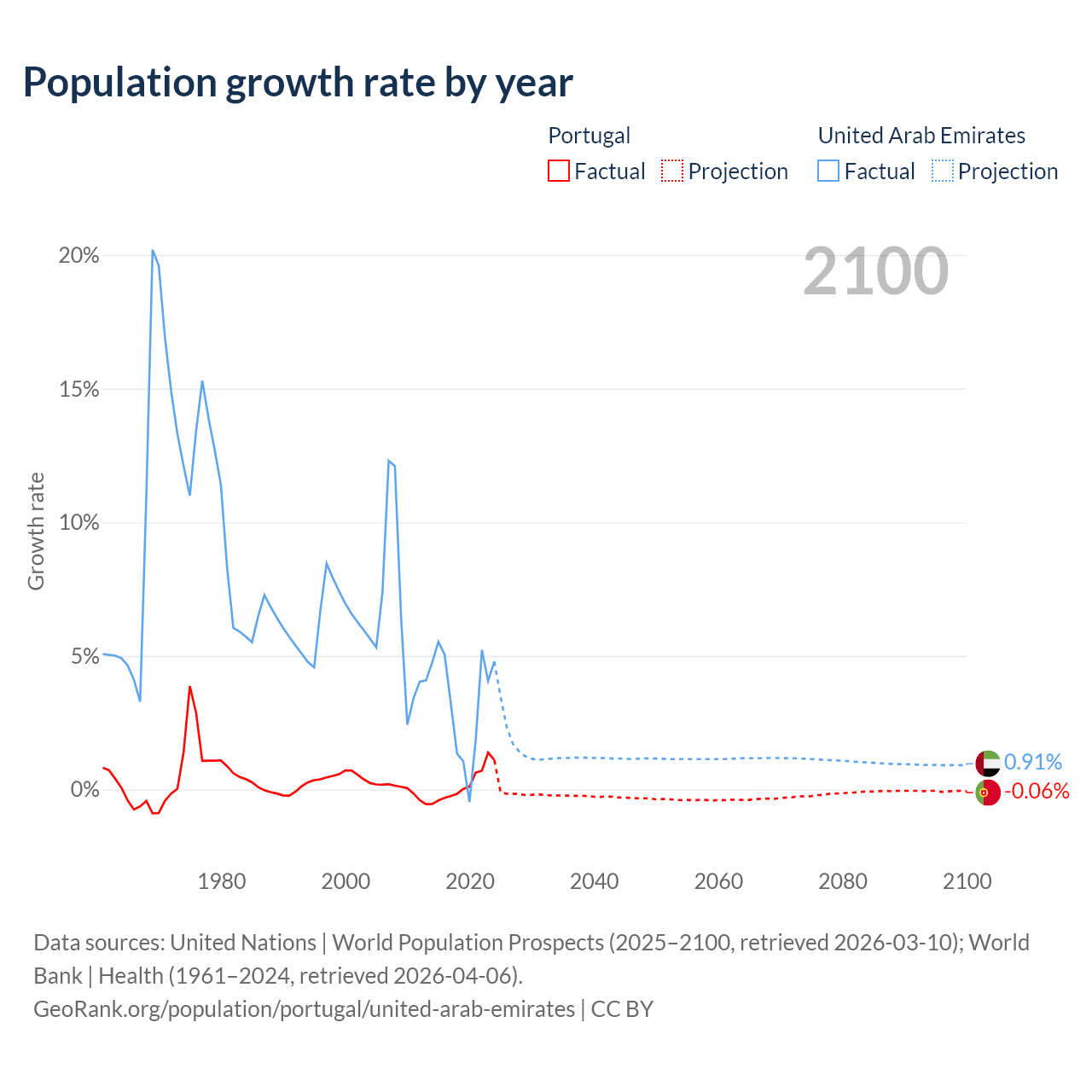 - For the last 10 years, Portugal has had an average growth rate of +0.21% per year vs +3.31% in the United Arab Emirates.