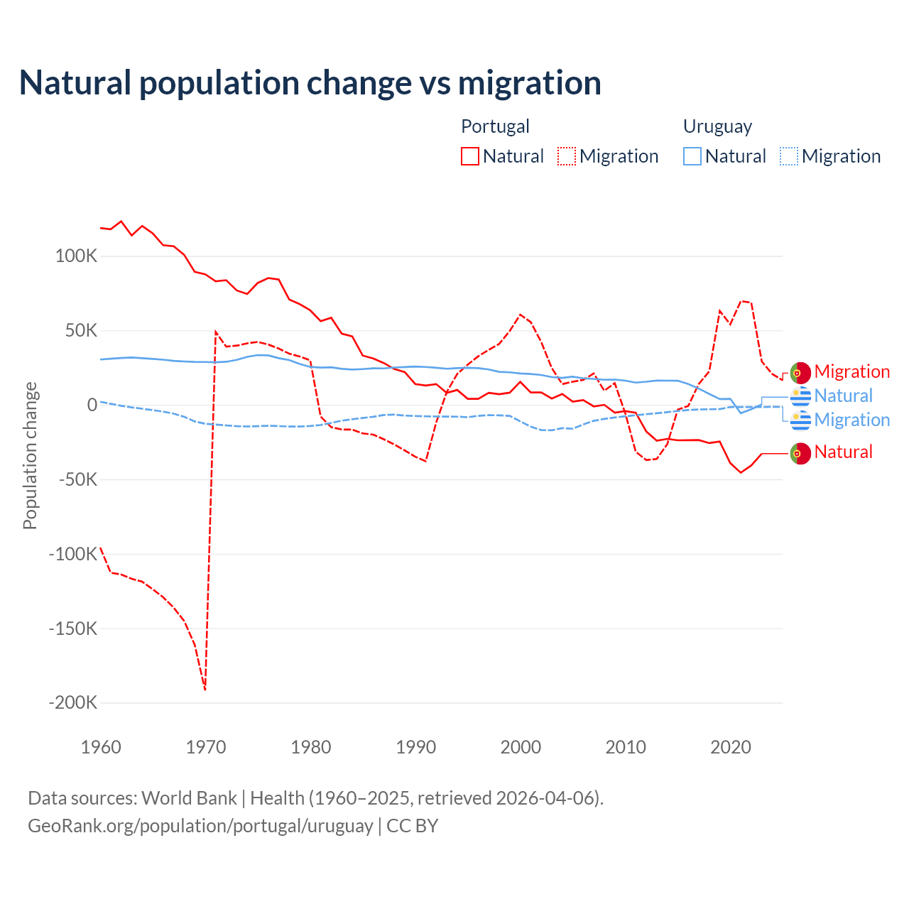 Over the last 10 years, 51% of the population change in Portugal is from natural causes (a loss of 302,748 people) and 49% is from migration (a gain of 290,554 people). In Uruguay 70% is from natural causes (a gain of 64,303 people) and 30% is from migration (a loss of 27,501 people).