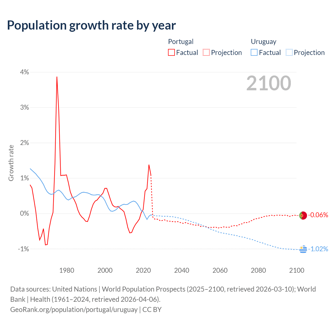 - For the last 10 years, Portugal has had an average growth rate of +0.21% per year vs +0.11% in Uruguay.