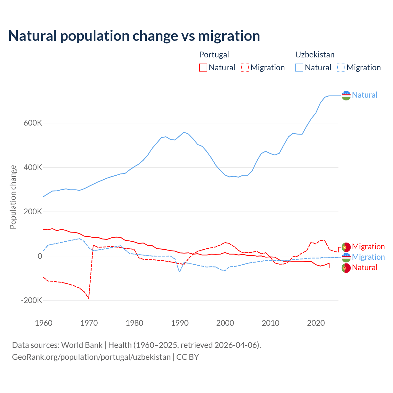 Over the last 10 years, 51% of the population change in Portugal is from natural causes (a loss of 302,748 people) and 49% is from migration (a gain of 290,554 people). In Uzbekistan 98.2% is from natural causes (a gain of 6,161,117 people) and 1.84% is from migration (a loss of 115,398 people).