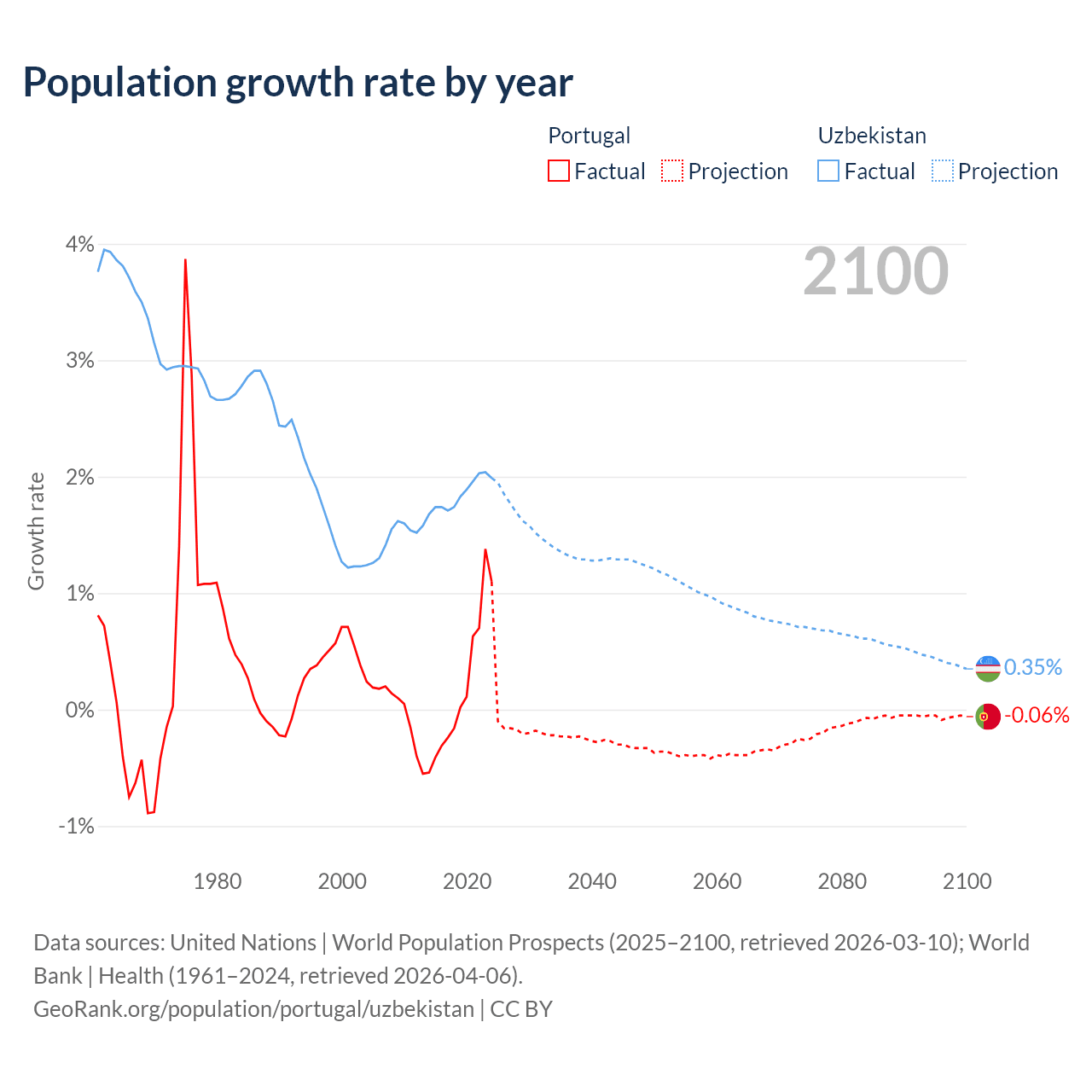 - For the last 10 years, Portugal has had an average growth rate of +0.21% per year vs +1.85% in Uzbekistan.