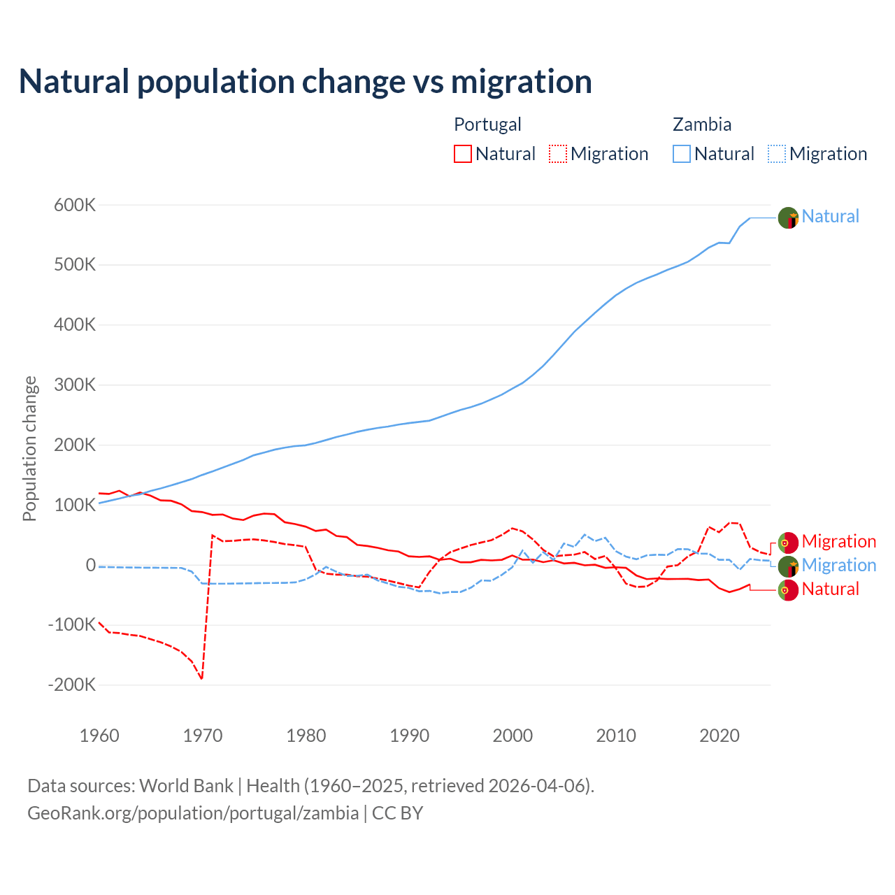 Over the last 10 years, 51% of the population change in Portugal is from natural causes (a loss of 302,748 people) and 49% is from migration (a gain of 290,554 people). In Zambia 97.4% is from natural causes (a gain of 5,233,797 people) and 2.58% is from migration (a gain of 138,554 people).