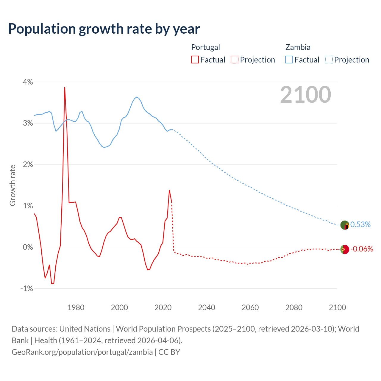 - For the last 10 years, Portugal has had an average growth rate of +0.21% per year vs +3% in Zambia.