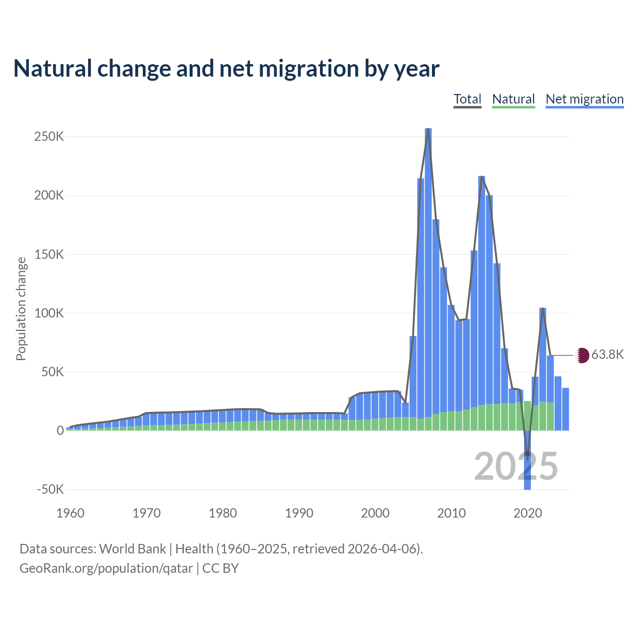 Over the last 10 years, 26.1% of the population change in Qatar is from natural causes (a gain of 232,009 people) and 73.9% is from migration (a gain of 655,712 people).