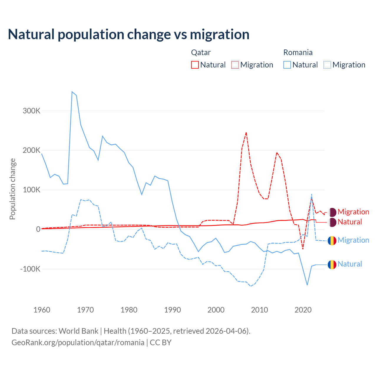 Over the last 10 years, 26.1% of the population change in Qatar is from natural causes (a gain of 232,009 people) and 73.9% is from migration (a gain of 655,712 people). In Romania 82% is from natural causes (a loss of 766,295 people) and 18% is from migration (a loss of 167,917 people).