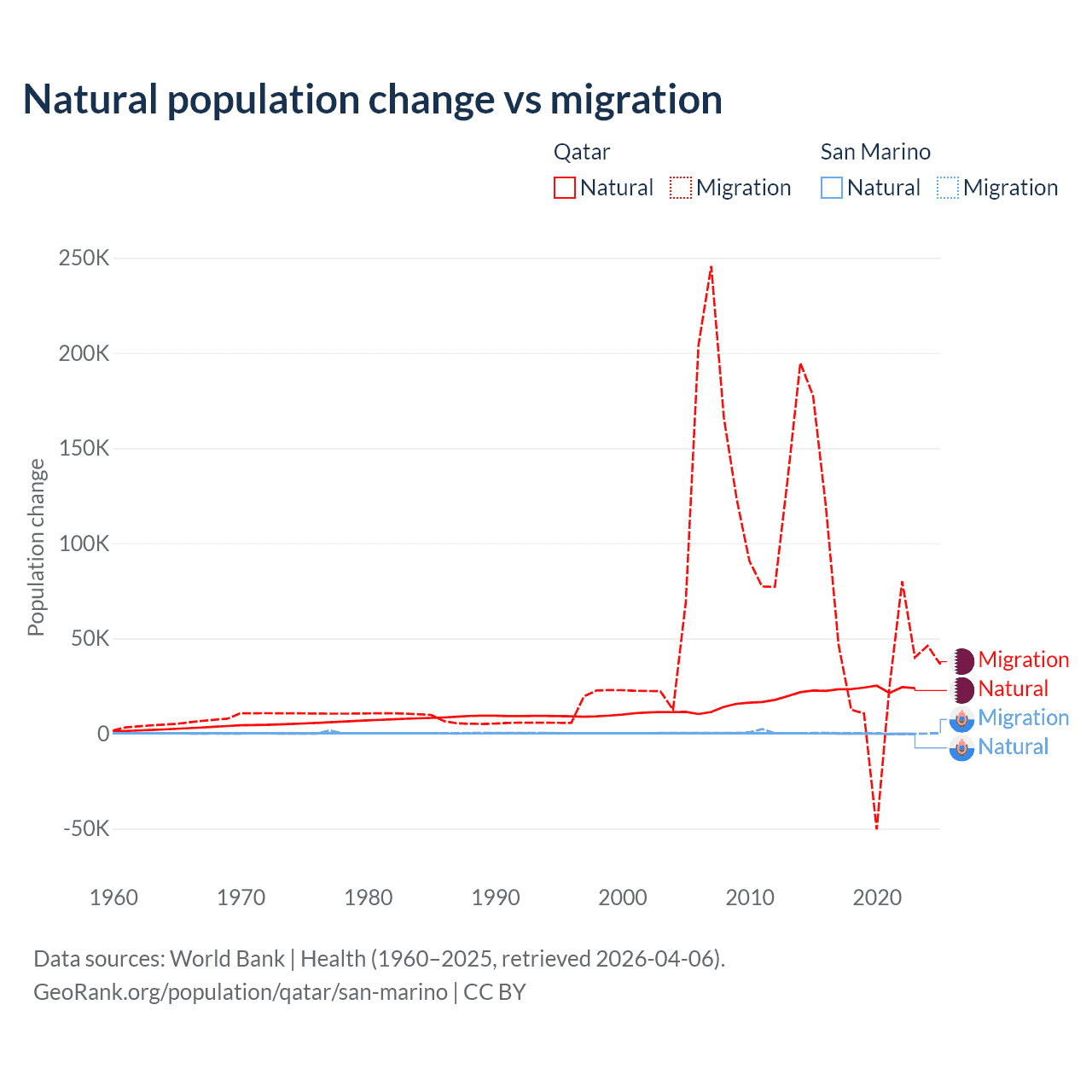 Over the last 10 years, 26.1% of the population change in Qatar is from natural causes (a gain of 232,009 people) and 73.9% is from migration (a gain of 655,712 people). In San Marino 40.9% is from natural causes (a loss of 358 people) and 59.1% is from migration (a gain of 517 people).