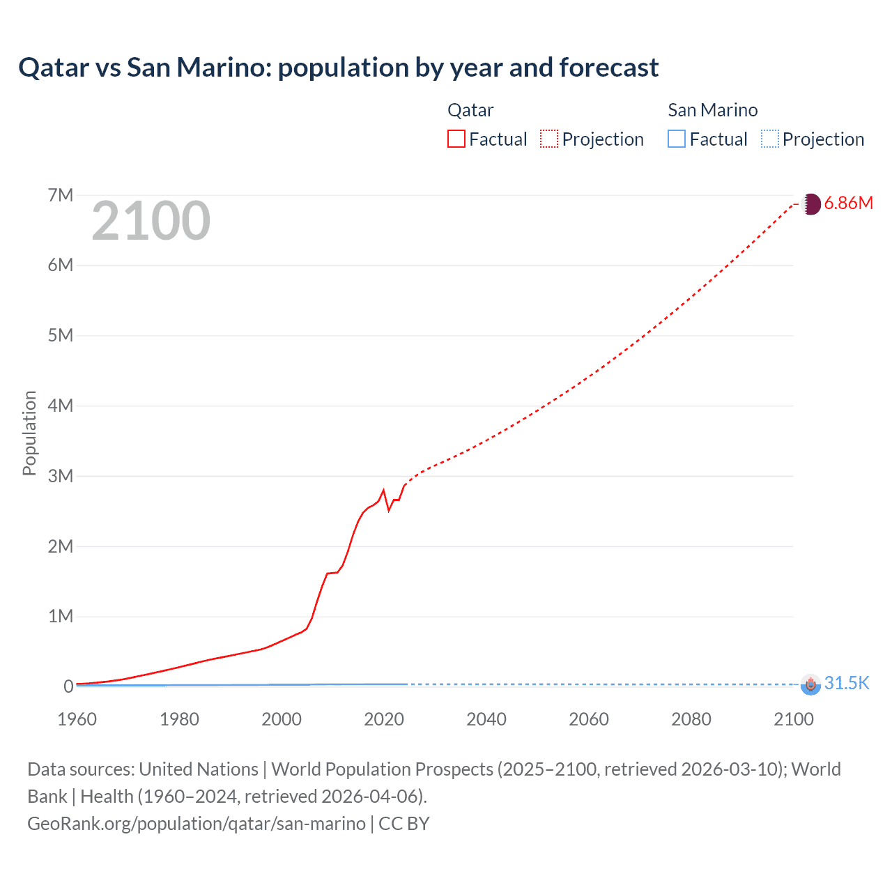 The latest officially reported population of Qatar was 2,857,822 in 2024 vs 33,977 people in San Marino in 2024. In 2026, based on the adjusted UN estimation, the current Qatar's population is 2,999,260 people compared to 33,967 in San Marino.