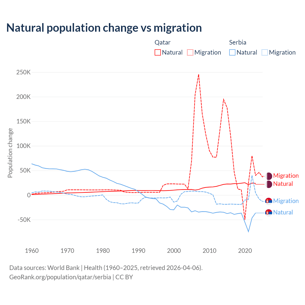 Over the last 10 years, 26.1% of the population change in Qatar is from natural causes (a gain of 232,009 people) and 73.9% is from migration (a gain of 655,712 people). In Serbia 83.3% is from natural causes (a loss of 435,148 people) and 16.7% is from migration (a loss of 87,110 people).