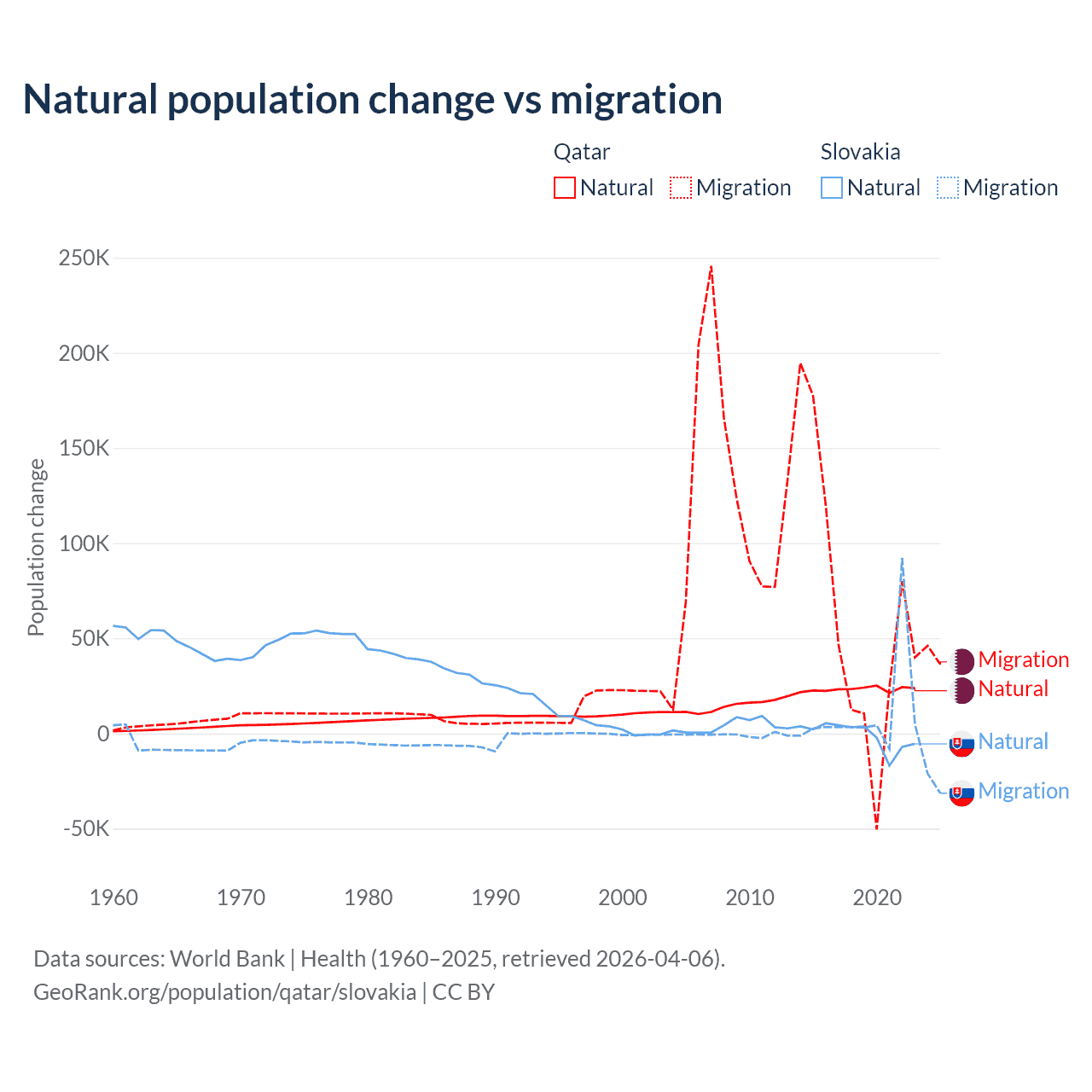 Over the last 10 years, 26.1% of the population change in Qatar is from natural causes (a gain of 232,009 people) and 73.9% is from migration (a gain of 655,712 people). In Slovakia 7.47% is from natural causes (a loss of 8,728 people) and 92.5% is from migration (a gain of 108,156 people).