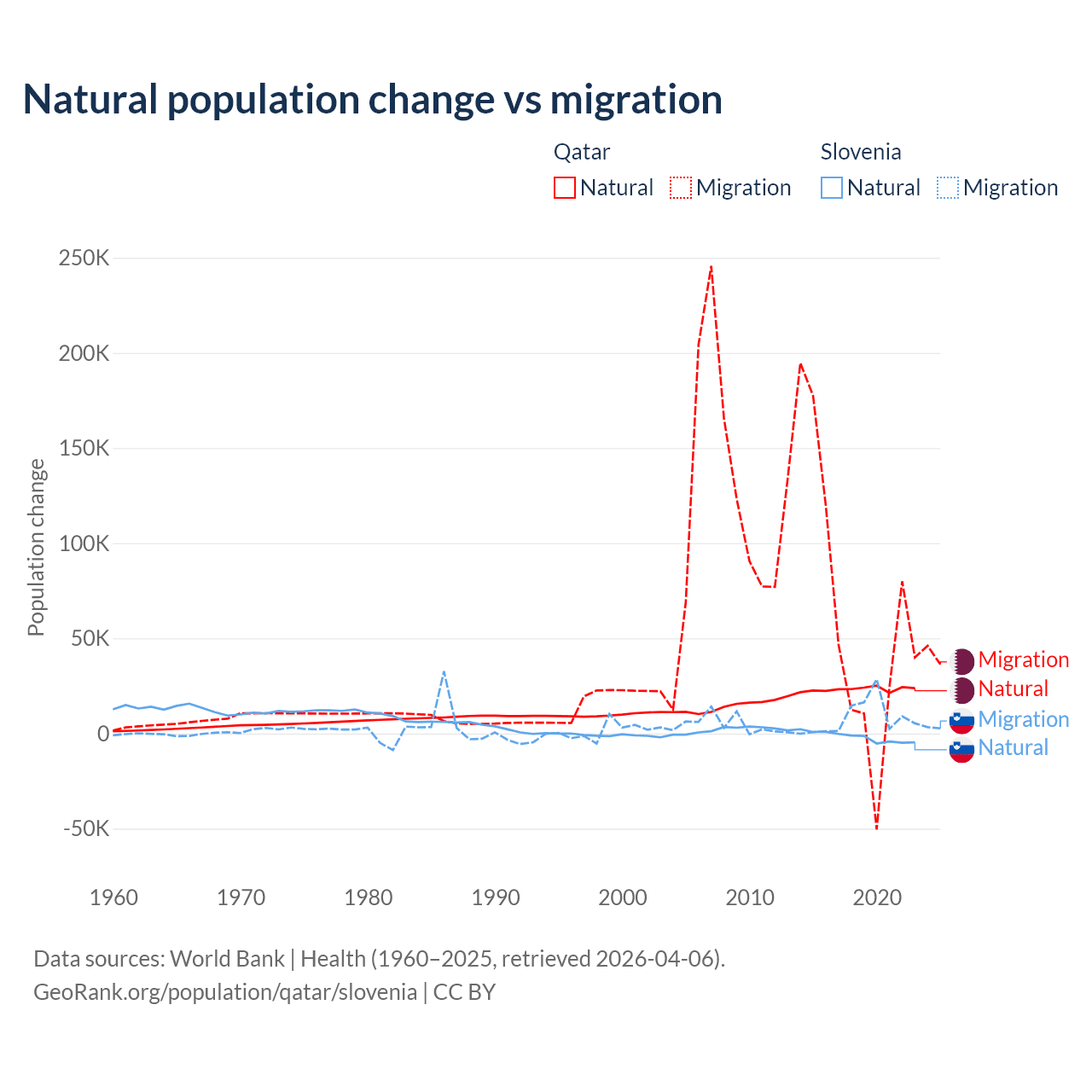 Over the last 10 years, 26.1% of the population change in Qatar is from natural causes (a gain of 232,009 people) and 73.9% is from migration (a gain of 655,712 people). In Slovenia 18.1% is from natural causes (a loss of 17,573 people) and 81.9% is from migration (a gain of 79,532 people).