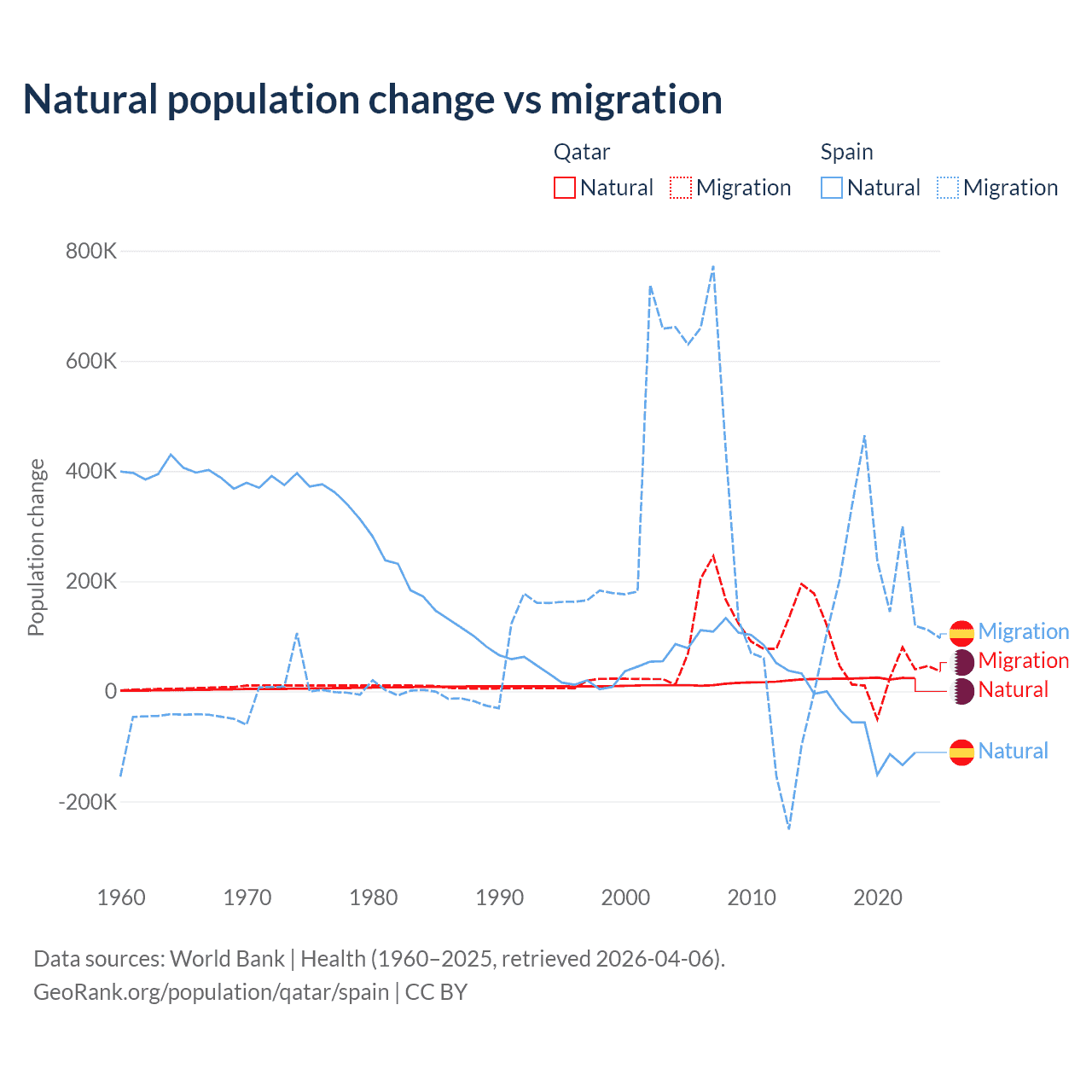 Over the last 10 years, 26.1% of the population change in Qatar is from natural causes (a gain of 232,009 people) and 73.9% is from migration (a gain of 655,712 people). In Spain 25.8% is from natural causes (a loss of 627,829 people) and 74.2% is from migration (a gain of 1,810,127 people).