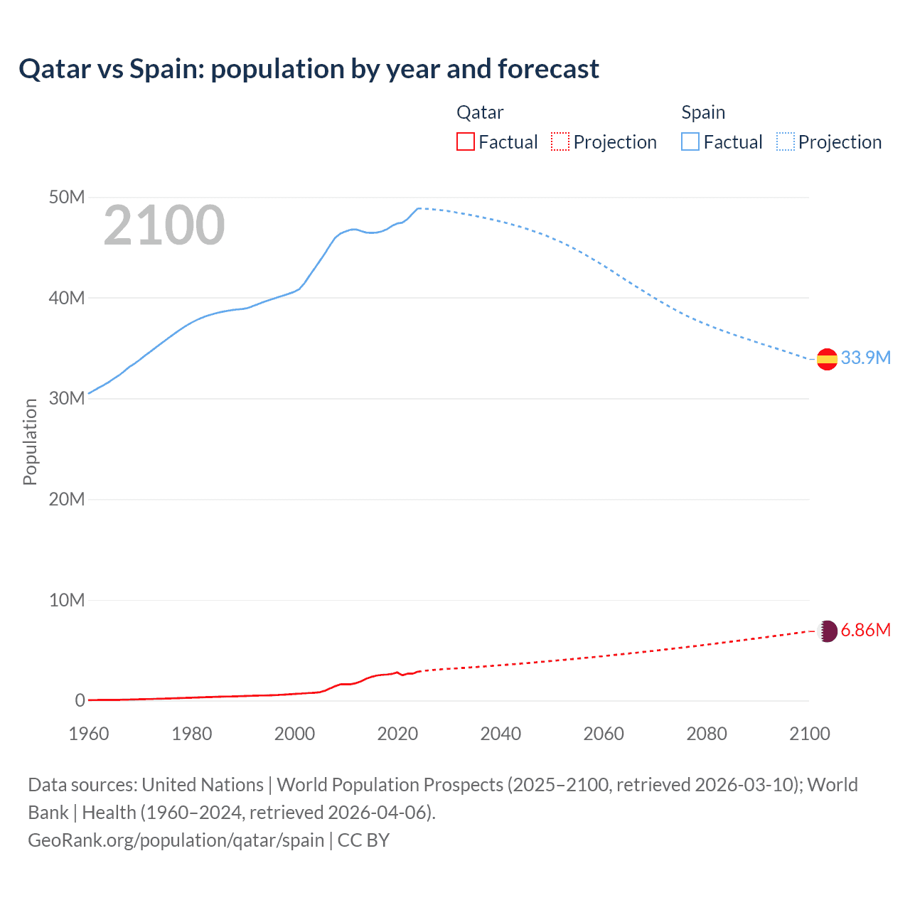 Qatar vs Spain: population by year and forecast